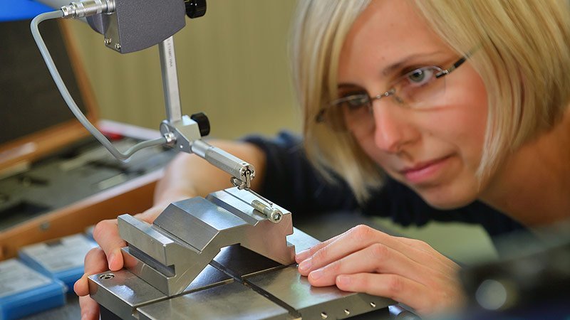 Dr. Kristin Hockauf, scientific staff member of Chemnitz University’s Professorship of Materials and Surface Engineering, measures the surface roughness of a high-strength aluminum screw. This research is conducted within the context of the Collaborative Research Centre 692: “High-strength aluminum-based lightweight materials for safety components”. The program received approximately 30 million euros in funding between 2006 and 2017 from the German Research Foundation (DFG). Photo: Press office image archive/Wolfgang Schmidt