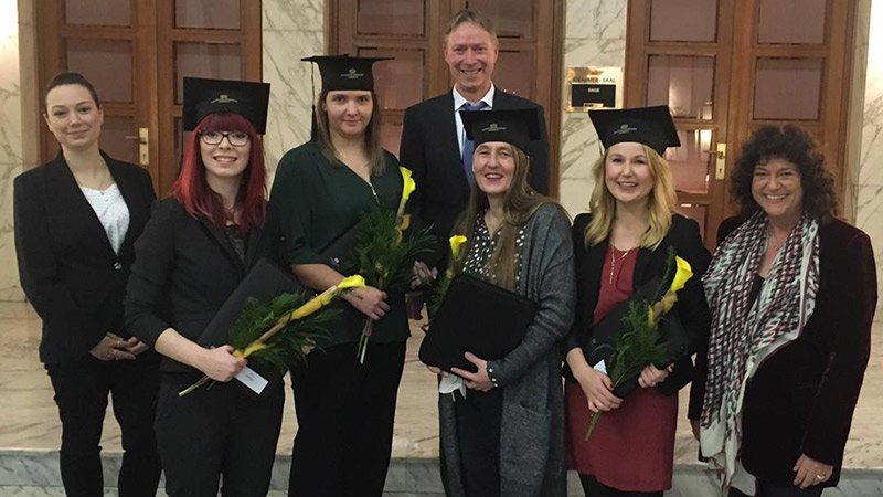 Am 7. Dezember 2018 nahmen über 30 Absolventen der Weiterbildungsstudiengänge aus den Bereichen Customer Relationship Management und Event an der feierlichen Verabschiedungsveranstaltung der TUCed im Hotel Chemnitzer Hof teil. Unter ihnen waren auch Christine Zeidler, Anne Krieger, Tina Schwaneberg und Andrea Diekhof – die ersten Absolventinnen des berufsbegleitenden Bachelorstudienganges Event- und Messemanagement. Alle vier begannen ihr Studium 2015 und schlossen es dieses Jahr bereits nach sechs Semestern ab. Dank ihres großen Engagements und der kontinuierlichen Teilnahme an allen angebotenen Lehrveranstaltungen haben sie damit den Bachelortitel sogar ein Jahr vor Ende der Regelstudienzeit erreicht. Dies macht nicht nur die Familien und Unterstützer der Absolventinnen, sondern auch die Studiengangsleiterin Prof. Dr. Cornelia Zanger und das Betreuungsteam der TUCed besonders stolz.
