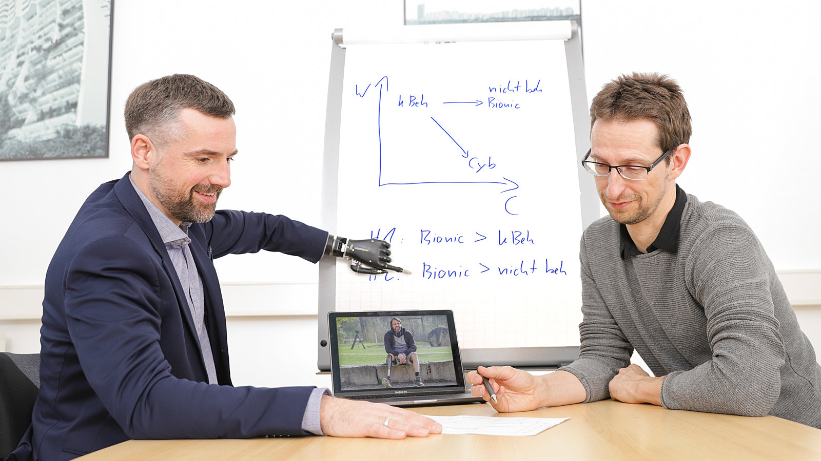 Prof. Dr. Bertolt Meyer (left), himself a user of a bionic prosthesis, and Junior Prof. Dr. Frank Asbrock have investigated how new bionic technology affects stereotypes of people with disabilities. Photo: Jacob Müller