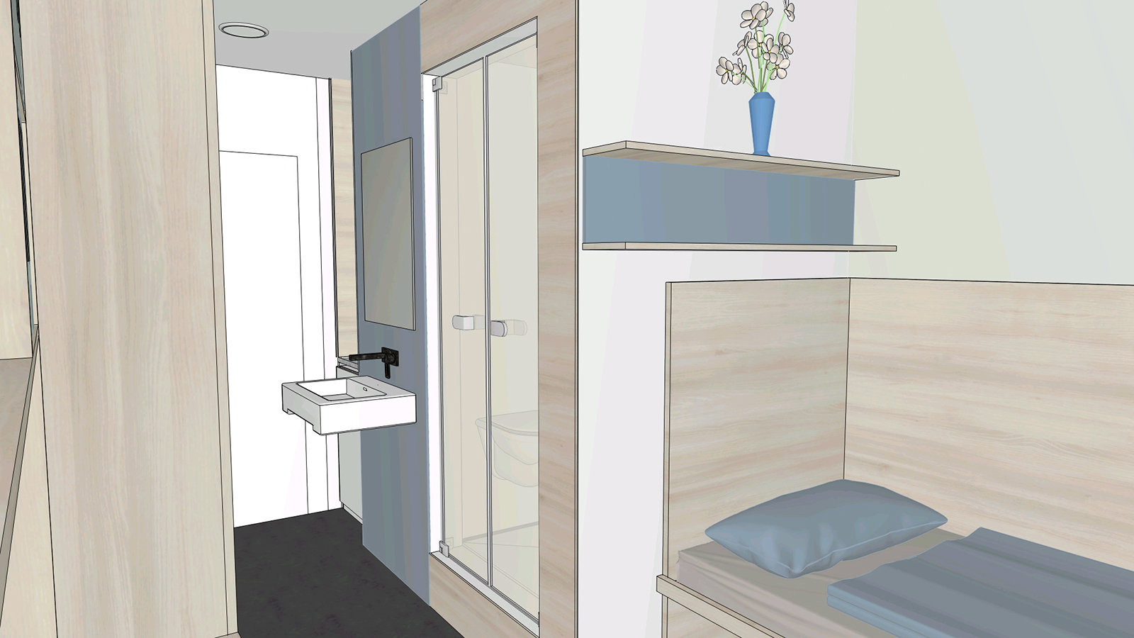 A view into the newly-designed room: a so-called “micro-bath” is situated in the middle of the room. Graphic: Cathleen Dämmler, Stiegler Büroeinrichtungen -