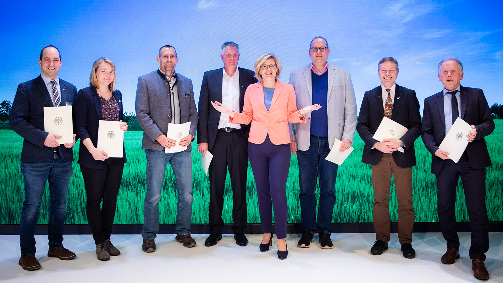 Die Bundesministerin für Ernährung und Landwirtschaft, Julia Klöckner (4.v.r.), treibt die Digitalisierung in der Landwirtschaft weiter voran. Die Ministerin übergab am 22. Januar 2020 auf der Internationalen Grünen Woche u. a. einen Förderbescheid an das Experimentierfeld "CattleHub". Prof. Dr. Ulrich Heinkel (3.v.l.), Inhaber der Professur Schaltkreis- und Systementwurf, nahm für die TU Chemnitz den Bescheid entgegen. Foto: BMEL/Gaertner