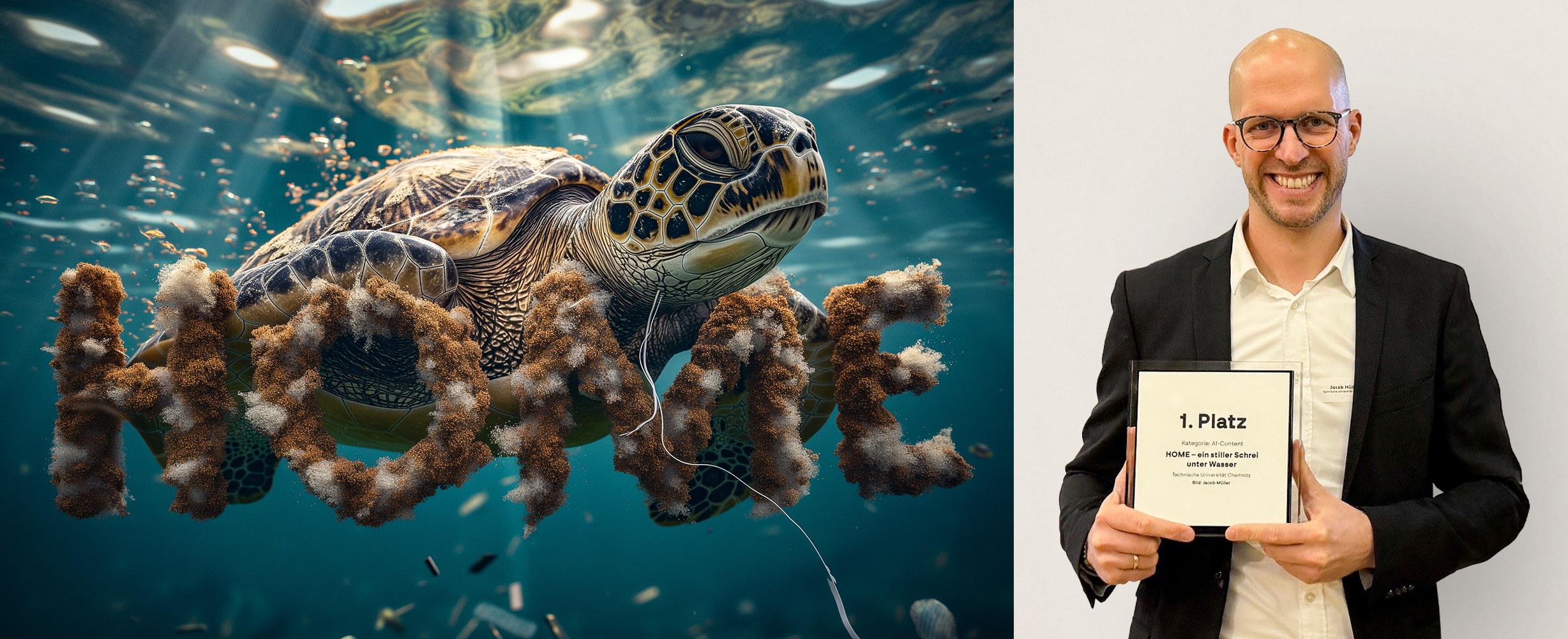 Jacob Müller von der Pressestelle und Crossmedia-Redaktion gewann in der erstmals ausgelobten Kategorie „AI Content“ den 1. Platz. Sein KI-generiertes Bild „HOME – ein stiller Schrei unter Wasser“ zeigt eine Meeresschildkröte in einer verschmutzten Unterwasserwelt und macht auf Umweltzerstörung aufmerksam. Über 600 Einreichungen konkurrierten im Wettbewerb; eine Fachjury und rund 22.000 Stimmen aus der Kommunikationsbranche bestimmten die Gewinner.