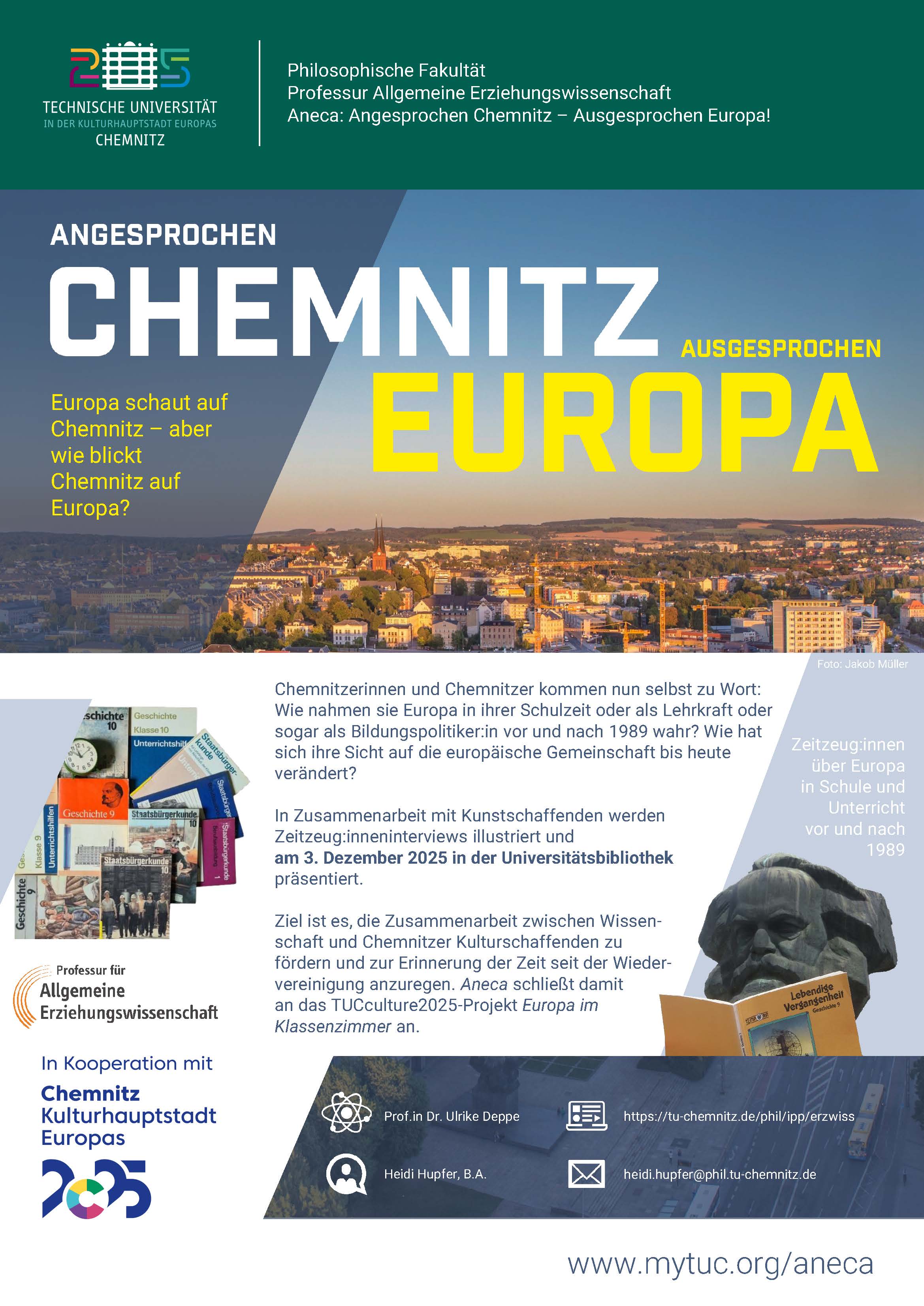 Europa schaut auf Chemnitz als Kulturhauptstadt – aber wie blickt Chemnitz auf Europa? Das Projekt „Angesprochen Chemnitz – Ausgesprochen Europa!“ eröffnet eine Multiperspektive auf die Erfahrungen ehemaliger Schüler:innen, Lehrer:innen und Bildungspolitiker:innen, um zu zeigen, wie sich das schulisch vermittelte Europa seit der Wendezeit verändert hat. In Zusammenarbeit mit Kunstschaffenden und dem Chemnitzer Geschichtsverein werden Zeitzeug:inneninterviews illustriert und am 3. Dezember in der Universitätsbibliothek präsentiert. Ziel ist es, die Zusammenarbeit zwischen Wissenschaft und Chemnitzer Kulturschaffenden zu fördern und zur Aufarbeitung der (Post-)Wendezeit anzuregen.
