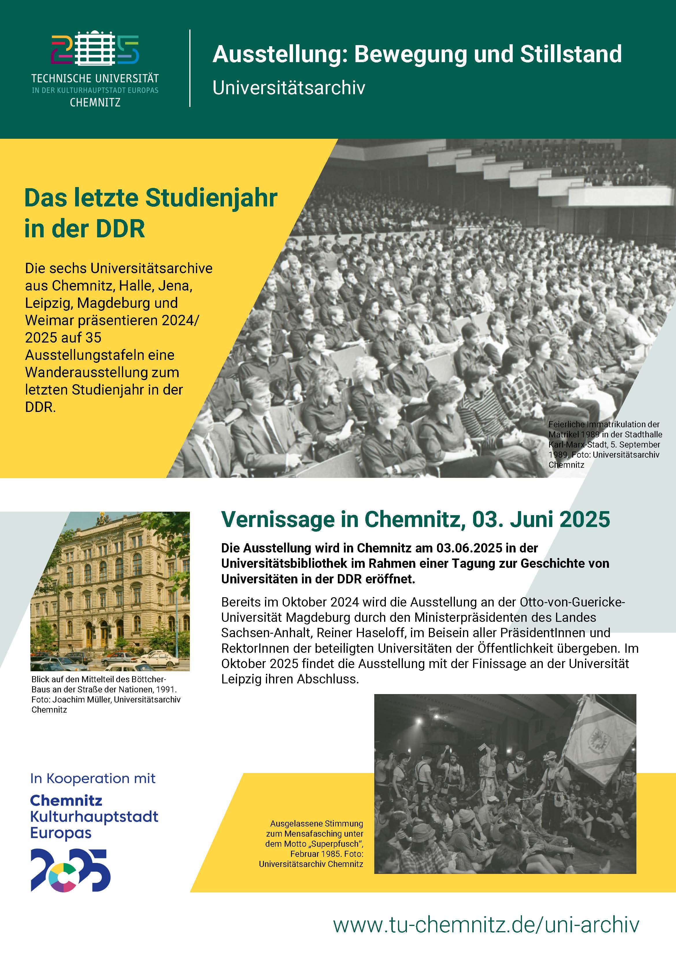 Die sechs Universitätsarchive aus Chemnitz, Halle, Jena, Leipzig, Magdeburg und Weimar planen im Jahr 2024 die Gestaltung einer Ausstellung zum letzten Studienjahr in der DDR. Insgesamt 35 Ausstellungstafeln sollen als Wanderausstellung an allen sechs Universitätsstandorten gezeigt werden. Für das letzte Studienjahr während der DDR-Zeit sollen möglichst alle Facetten des studentischen Lebens dargestellt werden. Dieses reicht von der Zulassung und der Immatrikulation, über Studienpläne und -organisation, den Hörsälen, Laboren und den Bibliotheken, der Freizeit und Kultur, der politischen Indoktrination innerhalb von und durch SED, FDJ, GST, der Wehrausbildung und Zivilverteidigung, der Internationalisierung bis hin zur Absolventenvermittlung.Die Ausstellung ist als Wanderausstellung konzipiert, wird im Oktober 2024 in Magdeburg eröffnet und soll ab 03.06.2025 in Chemnitz gezeigt werden. Für die Vernissage im Kulturhauptstadtjahr ist eine gemeinsame Veranstaltung mit dem Institut für Europäische Studien und Geschichtswissenschaften, an der ein größeres Projekt zur Geschichte der Studierendenschaft in der DDR-Zeit läuft, geplant.