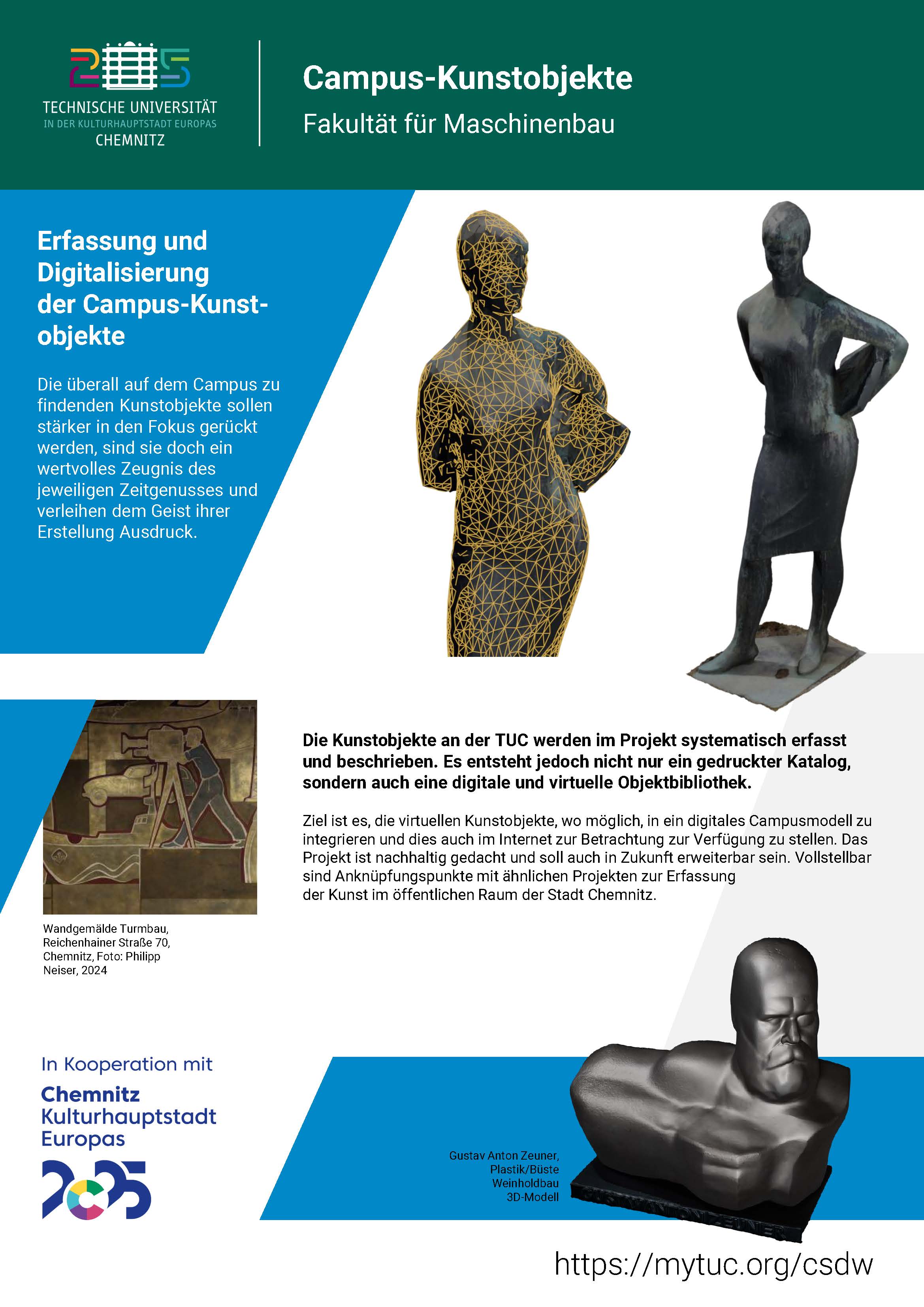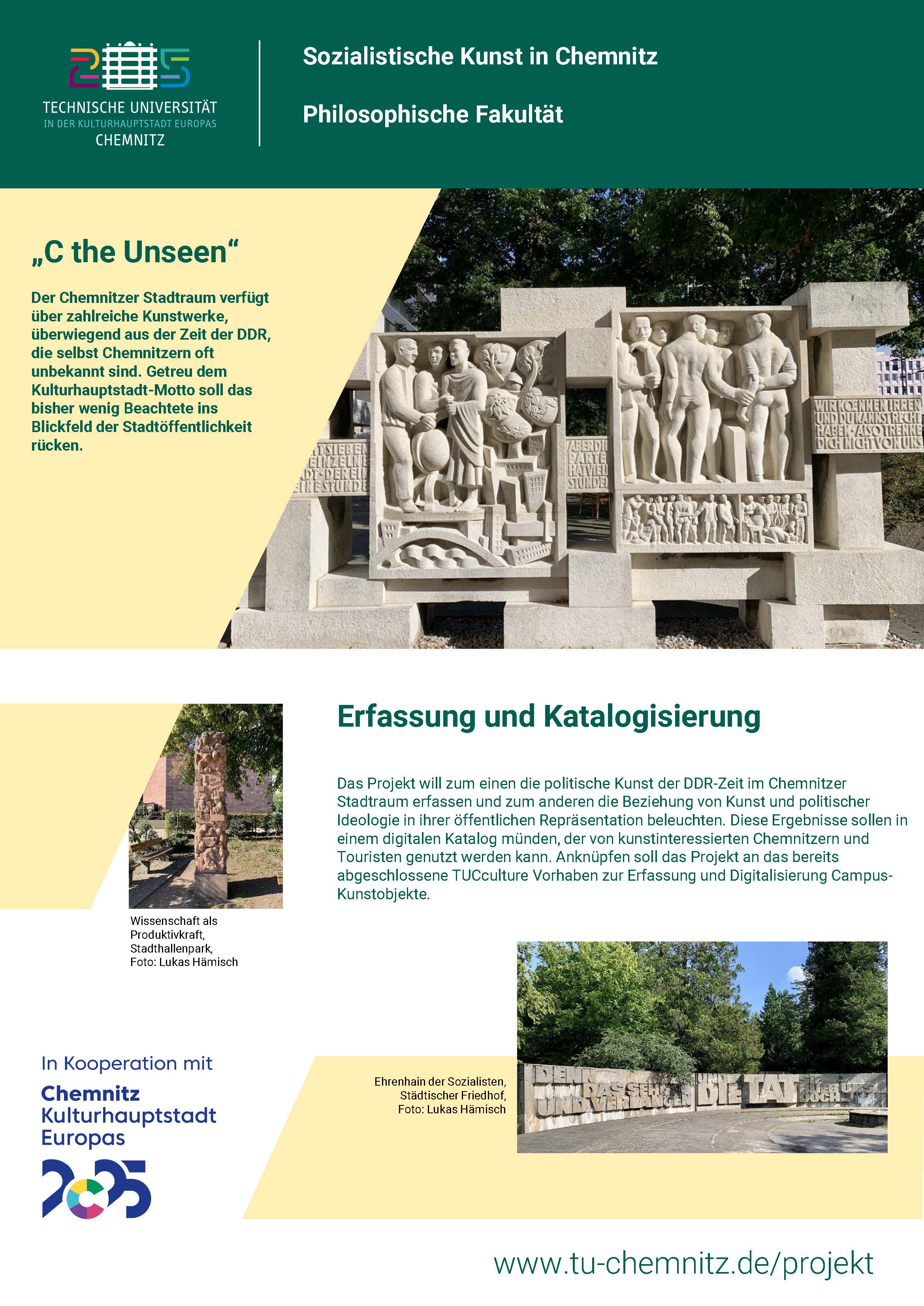 Der Chemnitzer Stadtraum verfügt über zahlreiche Kunstwerke, die selbst Chemnitzern oft unbekannt sind. Das Projekt will daher zum einen die politische Kunst der DDR-Zeit im Chemnitzer Stadtraum erfassen und zum anderen die Beziehung von Kunst und politischer Ideologie in ihrer öffentlichen Repräsentation beleuchten. Diese Ergebnisse sollen in einem digitalen Katalog münden, der von kunstinteressierten Chemnitzern und Touristen genutzt werden kann. Anknüpfen soll das Projekt an das bereits abgeschlossene TUCculture Vorhaben zur Erfassung und Digitalisierung Campus-Kunstobjekte.