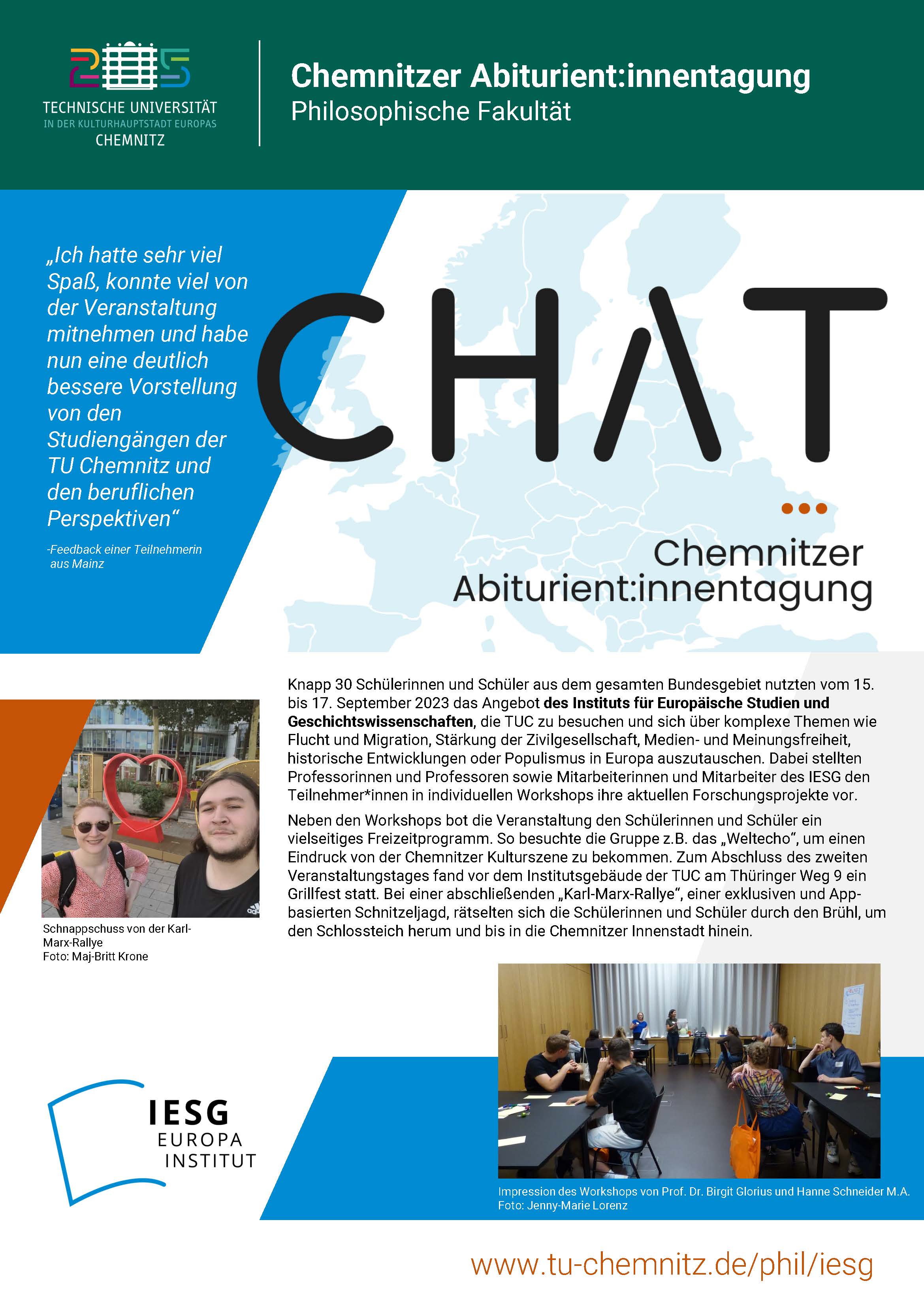 Vom 15. bis 17. September 2023 veranstaltet das gesamte Institut für Europäische Studien und Geschichtswissenschaften die "CHAT" - die Chemnitzer Abiturient:innentagung. Unter dem Motto "europaweit" erhalten die teilnehmenden Schüler:innen über ein umfangreiches Workshop-Angebot Einblicke in die aktuelle Europaforschung. Aus zehn Angeboten der Fachbereiche Europa-Studien und Europäische Geschichte stellen sie ihren individuellen Tagungsplan zusammen und nähern sich entsprechend ihrer Interessen dem Forschungsgegenstand "Europa“. Auf einer abschließenden Karl-Marx-Rallye können Schülerinnen und Schülern die Stadt Chemnitz kennenlernen.