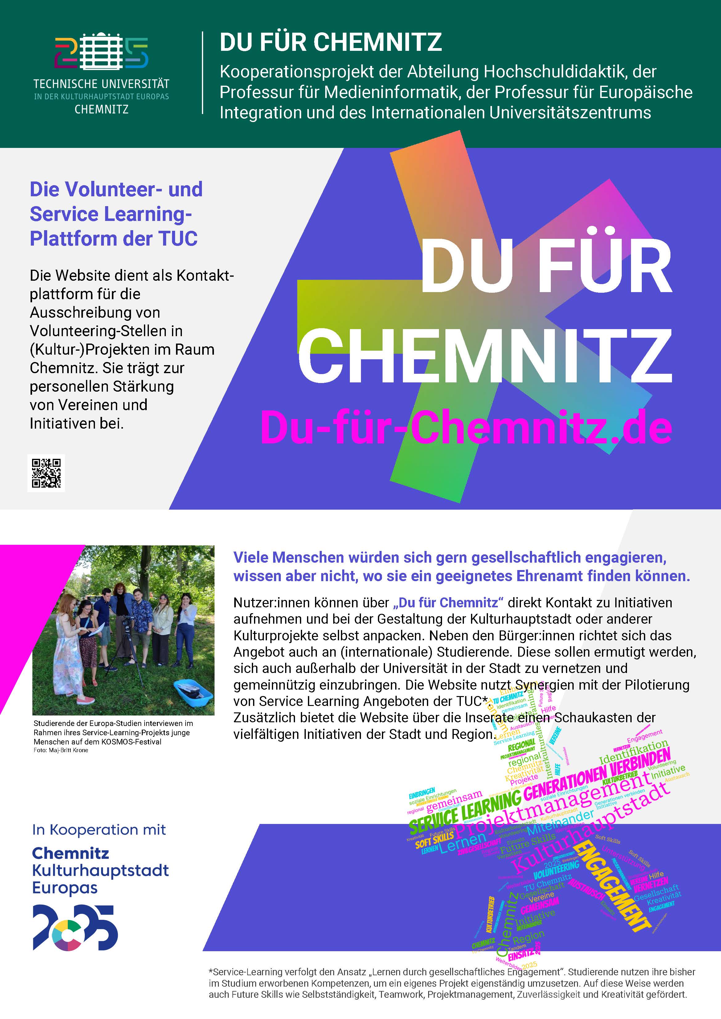Das Projektvorhaben widmet sich einer datenbasierten Kartierung zivilgesellschaftlicher Diskurse in Chemnitz. Zivilgesellschaftliche Aktivitäten prägen nicht nur die Chemnitzer Stadtöffentlichkeit sondern auch das Campusleben der TUC nachhaltig. Bisher gibt es keine Datensammlung, die das vielfältige Engagement zivilgesellschaftlicher Akteure dokumentiert und sichtbar macht. Hier setzt das Lehr-Lern-Projekt mit der Erstellung einer offenen Datensammlung an, die mit zivilgesellschaftlichen Projektpartner*innen, Studierenden und Bürger*innen erarbeitet und exploriert wird.
