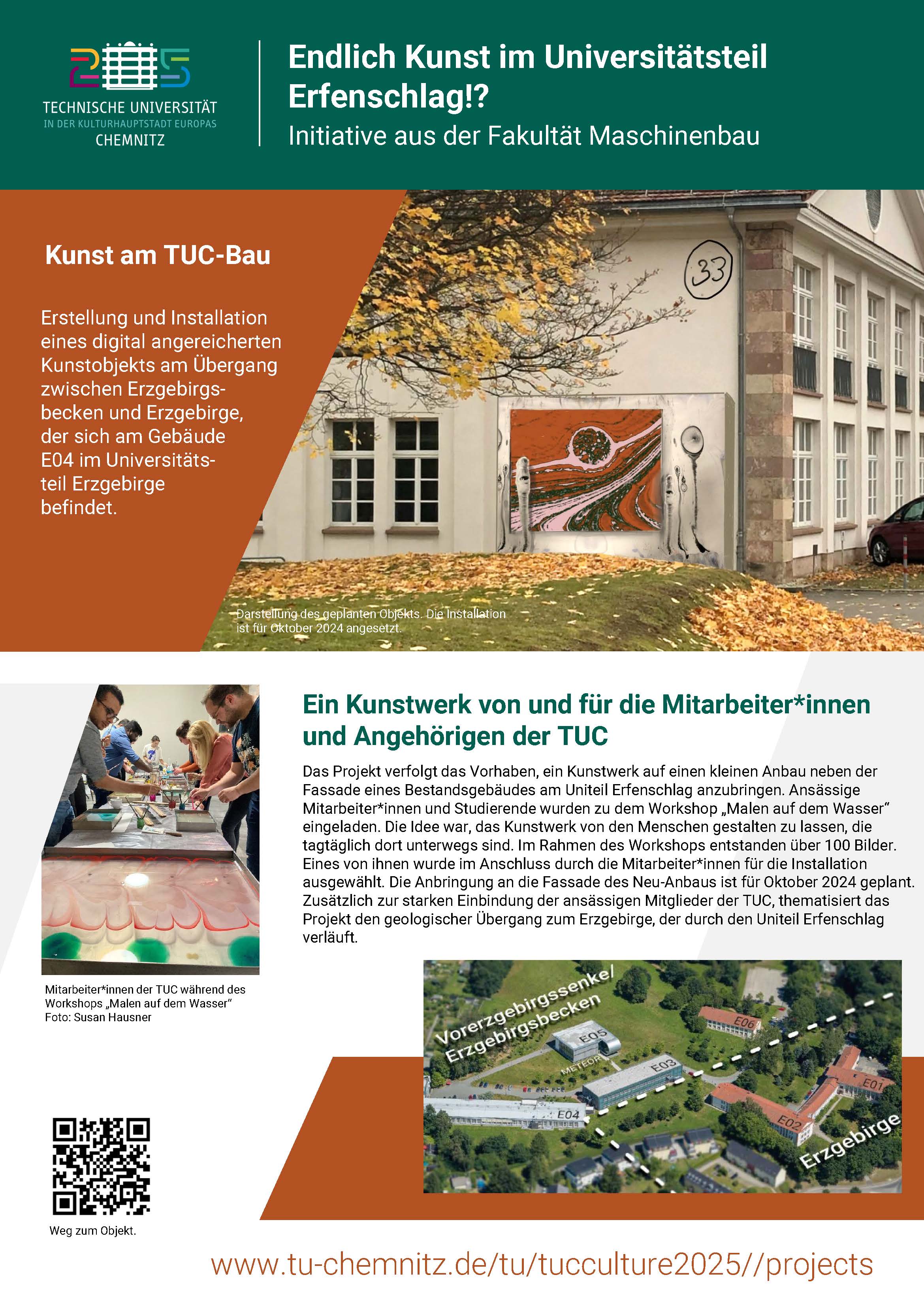 Im Projekt soll die Fassade eines Gebäudeanbaus im Universitätsteil Erfenschlag mit Kunst versehen werden, die das Thema „Übergang“ und damit den quer durch den Uniteil verlaufenden geologischen Übergang zwischen Erzgebirge und Vorerzgebirgssenke aufgreift. Durch Installation von klappbaren Lamellenwerden die Betrachter eingeladen, die Fläche zu bewegen, sie auf- und zuzuklappen. Zwei Bilder entstehen, in denen zwei Künstler das Thema „Übergang“ aus ihrem Blickwinkel darstellen. Einerseits sollen die geologischen Gegebenheiten der Gesteine, die sich unter dem Betrachter befinden, illustriert werden und andererseits ist es durch einen QR-Code möglich, mit einer Augmented Reality Show in die Gesteinswelt abzutauchen.