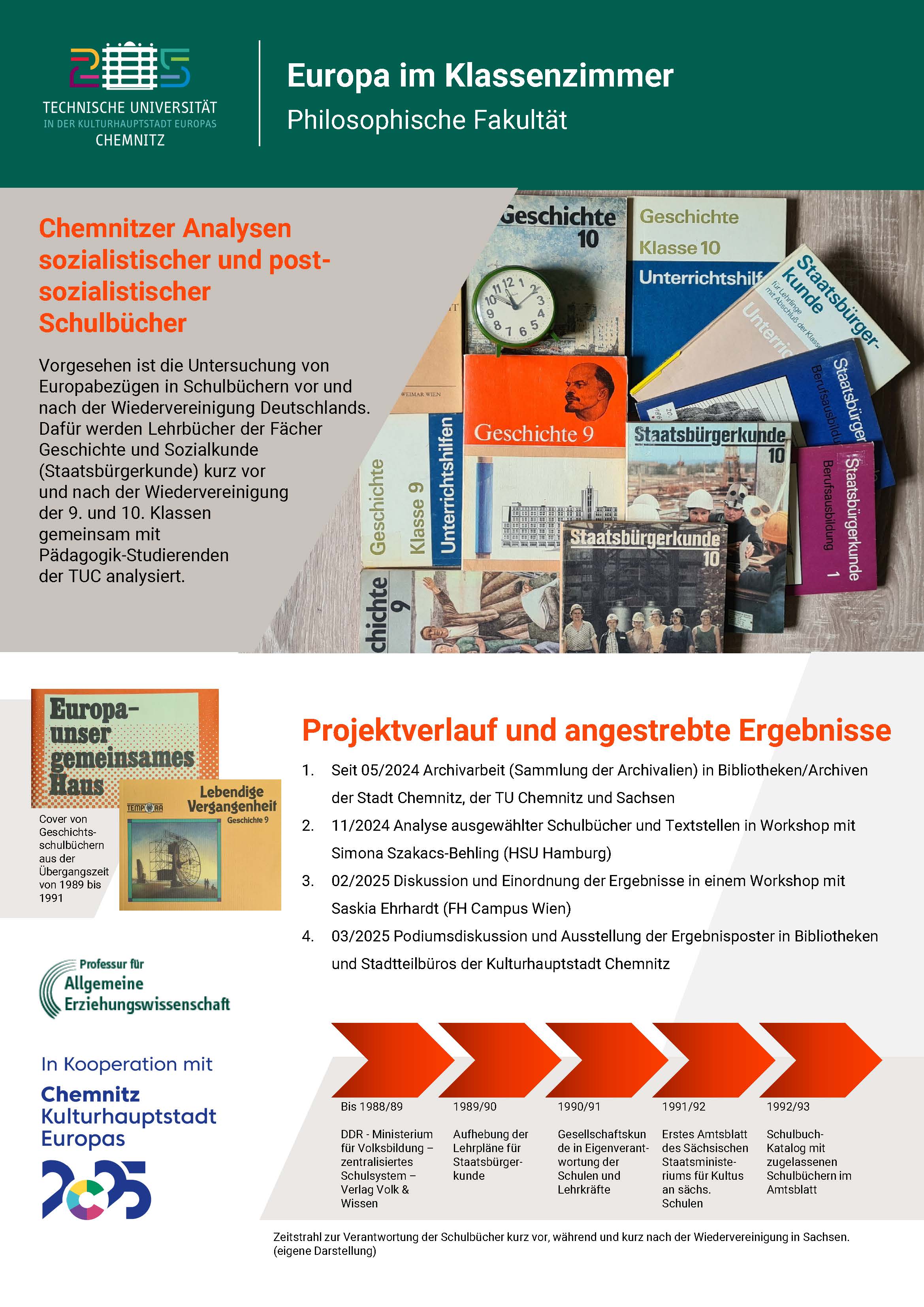 Mit dem Projekt werden Europabezüge vor und nach der Wiedervereinigung Deutschlands und dem "Fall des Eisernen Vorhangs" in Schulbüchern und Lernmaterialien der DDR und des Landes Sachsen, die insbesondere in den Bibliotheken und Archiven in Chemnitz vorliegen, beleuchtet. Damit werden die Art und Weise der Thematisierung Europas, aber auch die regional-europäischen Verortungen sowie Welt- und Menschenbilder herausgearbeitet und sichtbar gemacht. Im Rahmen des Projekts werden mit Studierenden Lehrbücher der Fächer Geschichts- und Sozialkunde (in der DDR Staatsbürgerkunde) kurz vor und nach der Wiedervereinigung der 9. und 10. Klassen recherchiert, katalogisiert und analysiert.