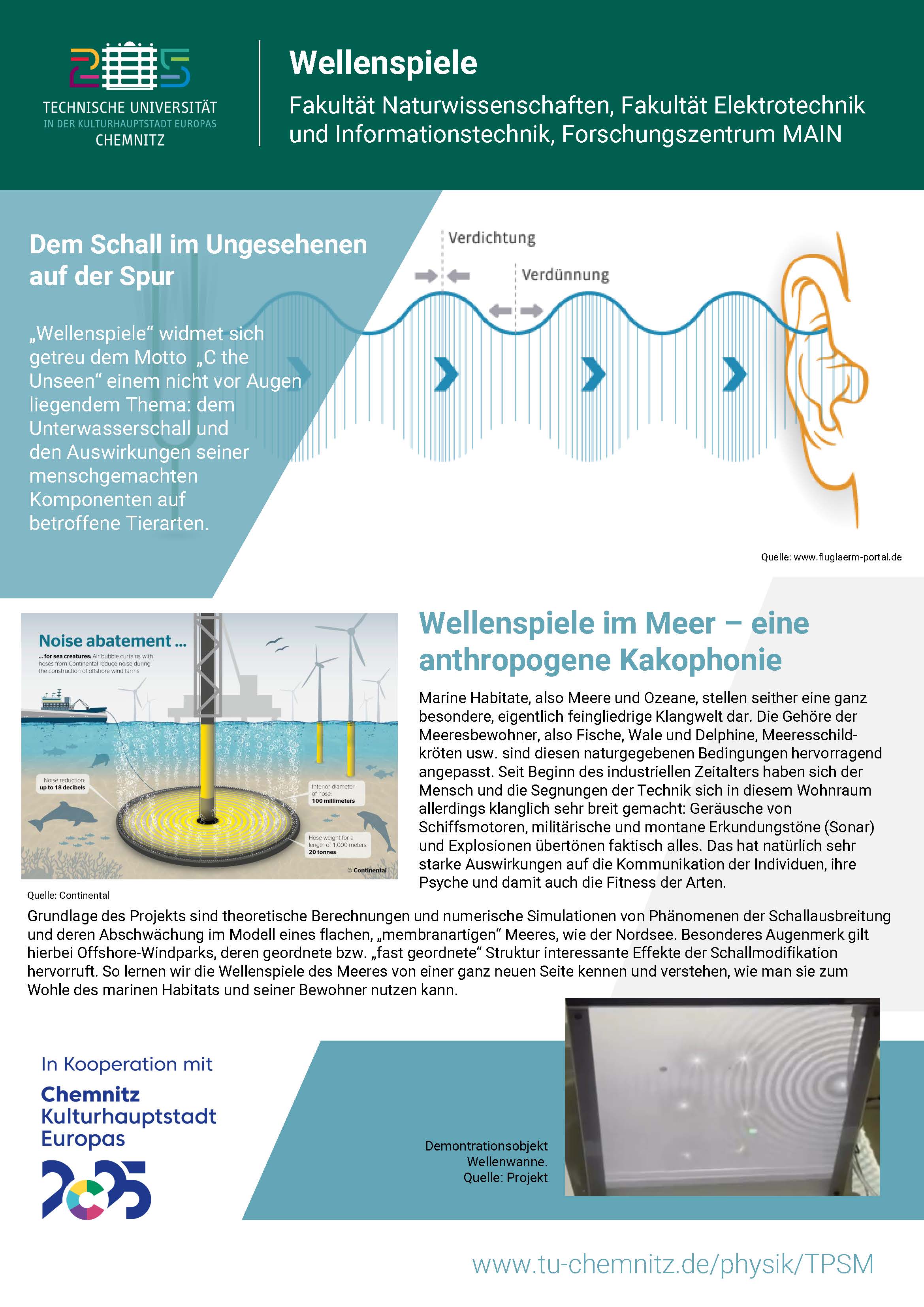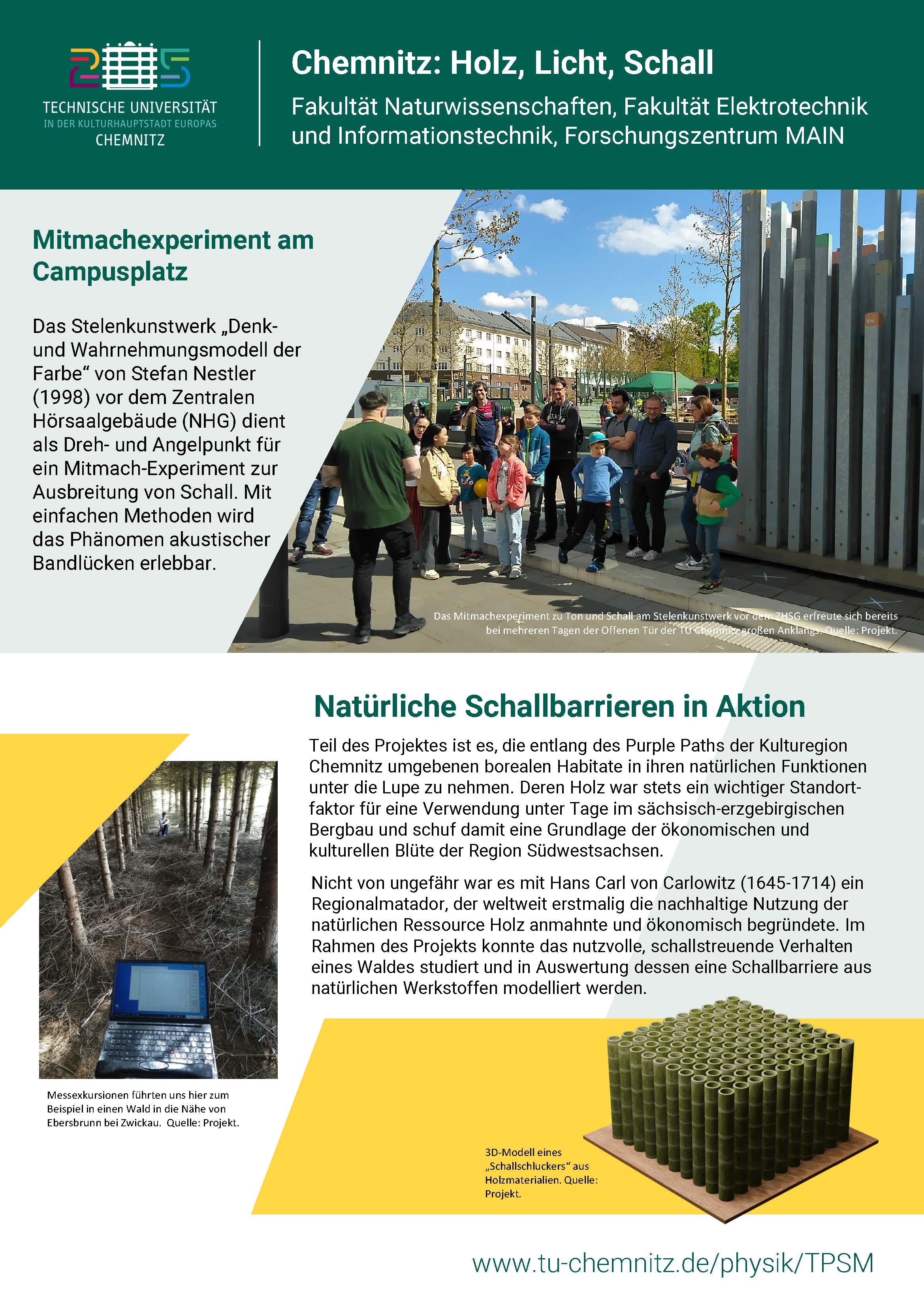 Wissenschaft und Kultur sind untrennbar miteinander verknüpft. Das betrifft sowohl den Erkenntnisprozess innerhalb der Disziplinen als auch die Interaktion mit der Gesellschaft. Licht und Schall sind physikalische Phänomene, die mit den menschlichen Sinnen wahrnehmbar und wissenschaftlich beschrieben sind, den menschlichen Zivilisationsprozess geprägt und in Kunst und Kultur Eingang gefunden haben. Das Projekt "Chemnitz - Holz, Licht und Schall" versucht, das Thema aus verschiedenen Blickwinkeln, von der Natur- über die Ingenieurwissenschaft bis zur Kunst hin zu beschreiten und verfolgt dabei folgende Teilziele: