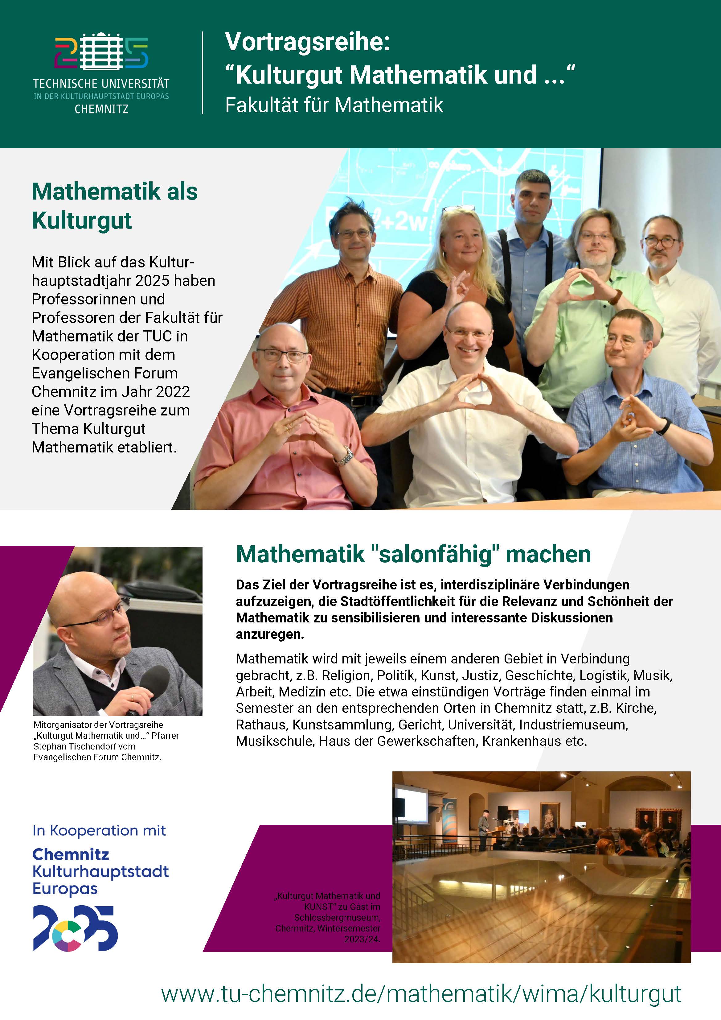 Ausgelöst durch die erfolgreiche Bewerbung von Chemnitz als Kulturhauptstadt 2025 führt die Fakultät für Mathematik gemeinsam mit dem Evangelischen Forum Chemnitz die Vortragsreihe "Kulturgut Mathematik und ..." durch. Dabei wird Mathematik mit jeweils einem anderen Gebiet verbunden, z.B. Religion, Politik, Kunst, Justiz, Geschichte, Logistik, Musik, Arbeit etc. Die etwa einstündigen Vorträge finden an den entsprechenden Orten in Chemnitz stattfinden, z.B. Kirche, Rathaus, Kunstsammlung, Gericht, Universität, Eisenbahnmuseum, Musikschule, Haus der Gewerkschaften etc. Die Vorträge machen die Mathematik "salonfähig", helfen interdisziplinäre Verbindungen auszuarbeiten, sensibilisieren die Stadtöffentlichkeit für die Relevanz der Mathematik und regen zu interessanten Diskussionen an.
