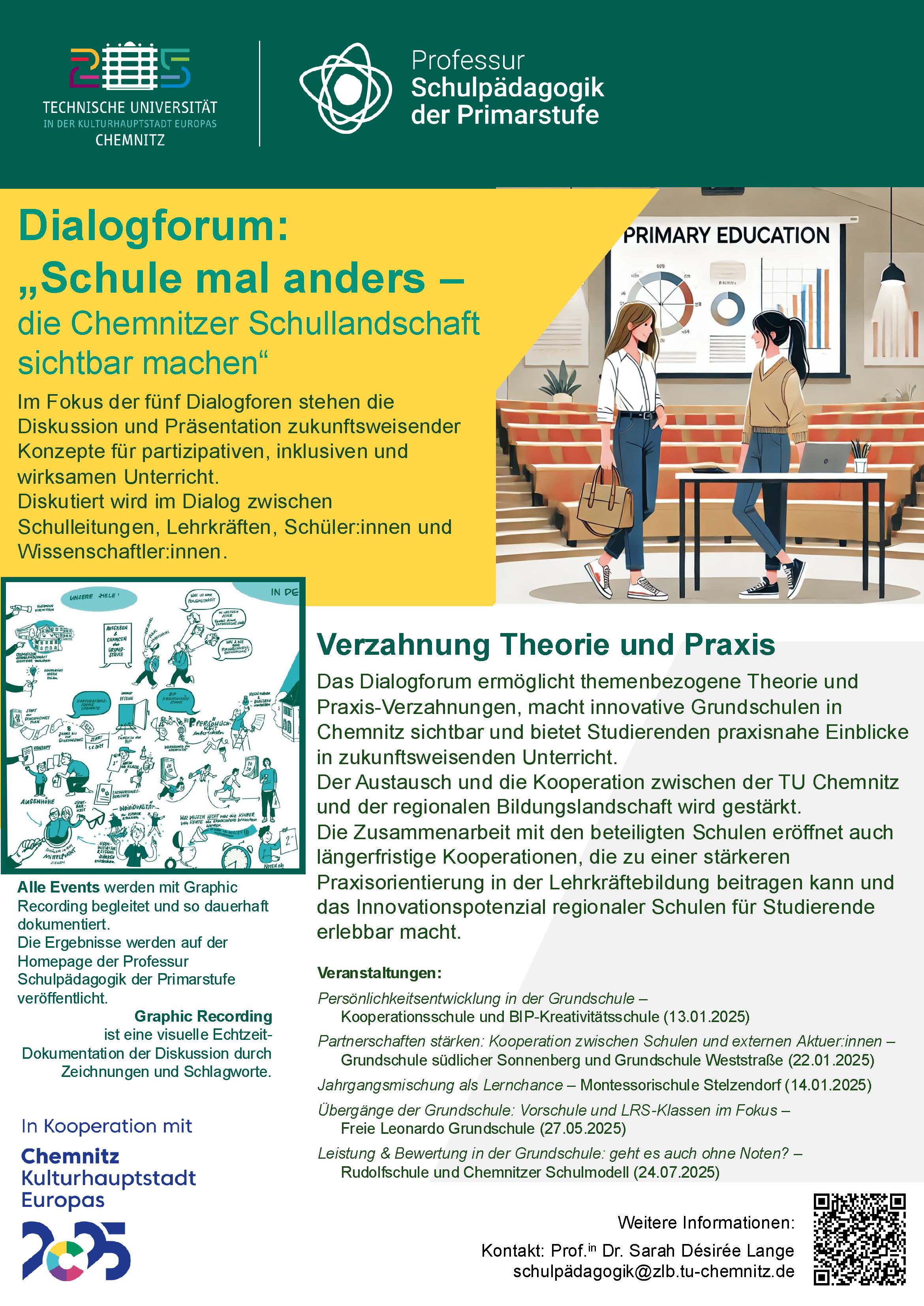 Mit dem Dialogforum „Grundschule mal anders“ geht es darum, die Vielfalt innovativer Grundschulen in Chemnitz sichtbar zu machen. An jedem der fünf Events wird ein aktuelles Bildungsthema (z.B. Leistung) diskutiert. Dazu stellen sich jeweils zwei Schulen vor, die bspw. alternative Leistungsbewertungen innovativ umsetzen. Ziel des Dialogs zwischen den Schulleitungen, den Lehrkräfte der Schulen und Vertreter:innen der Wissenschaft ist es, verschiedene Perspektiven zu beleuchten und Ideen abzuleiten, wie Unterricht innovativ, partizipativ und effektiv umgesetzt werden kann. Der Dialog wird mit Graphic Recording dokumentiert und die Ergebnisse digital und analog ausgestellt.