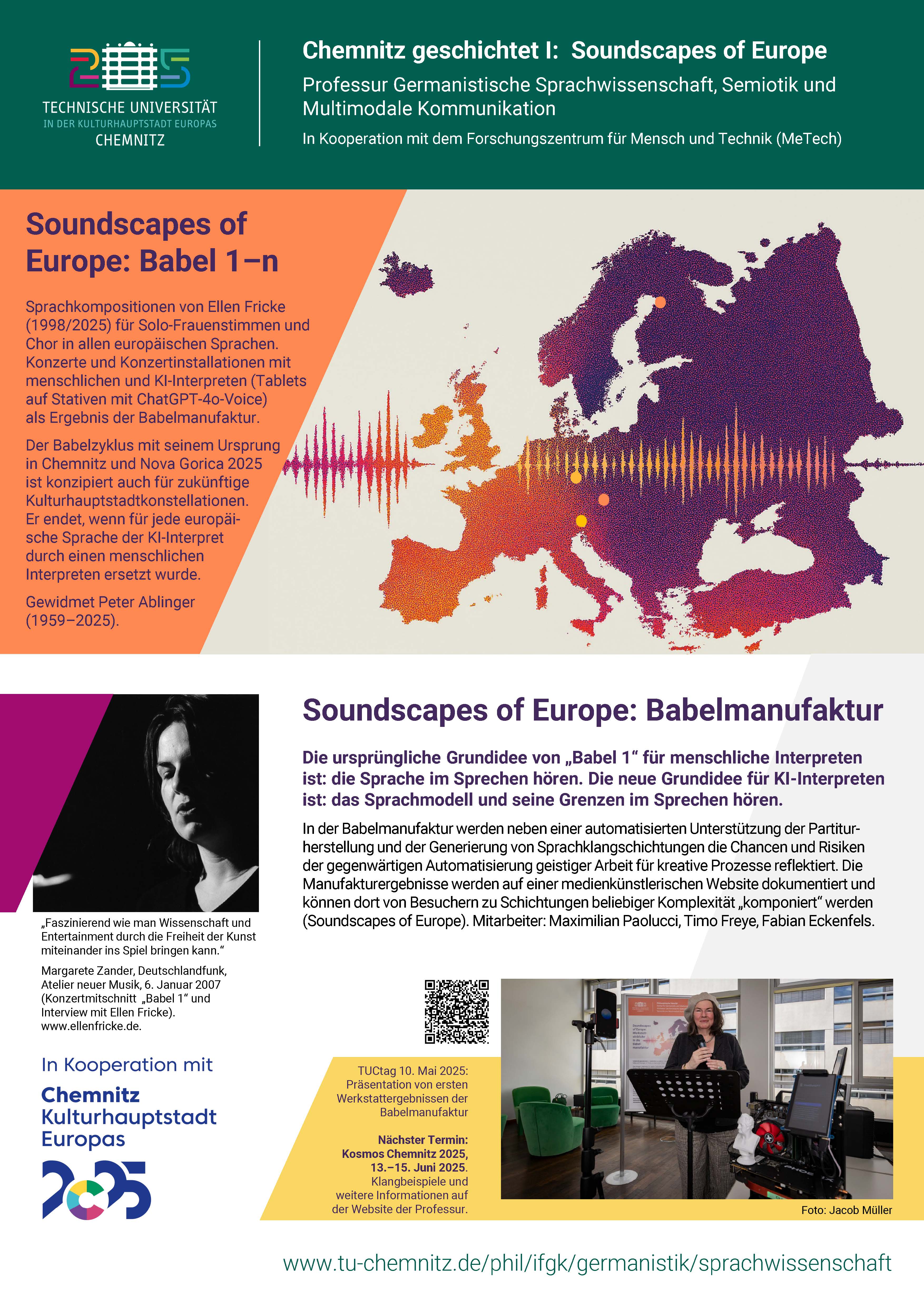 - „Soundscapes of Europe: Babelmanufaktur“ mit ChatGPT4o-unterstützter Partiturherstellung und KI-Interpretengenerierung für alle europäischen Sprachen.