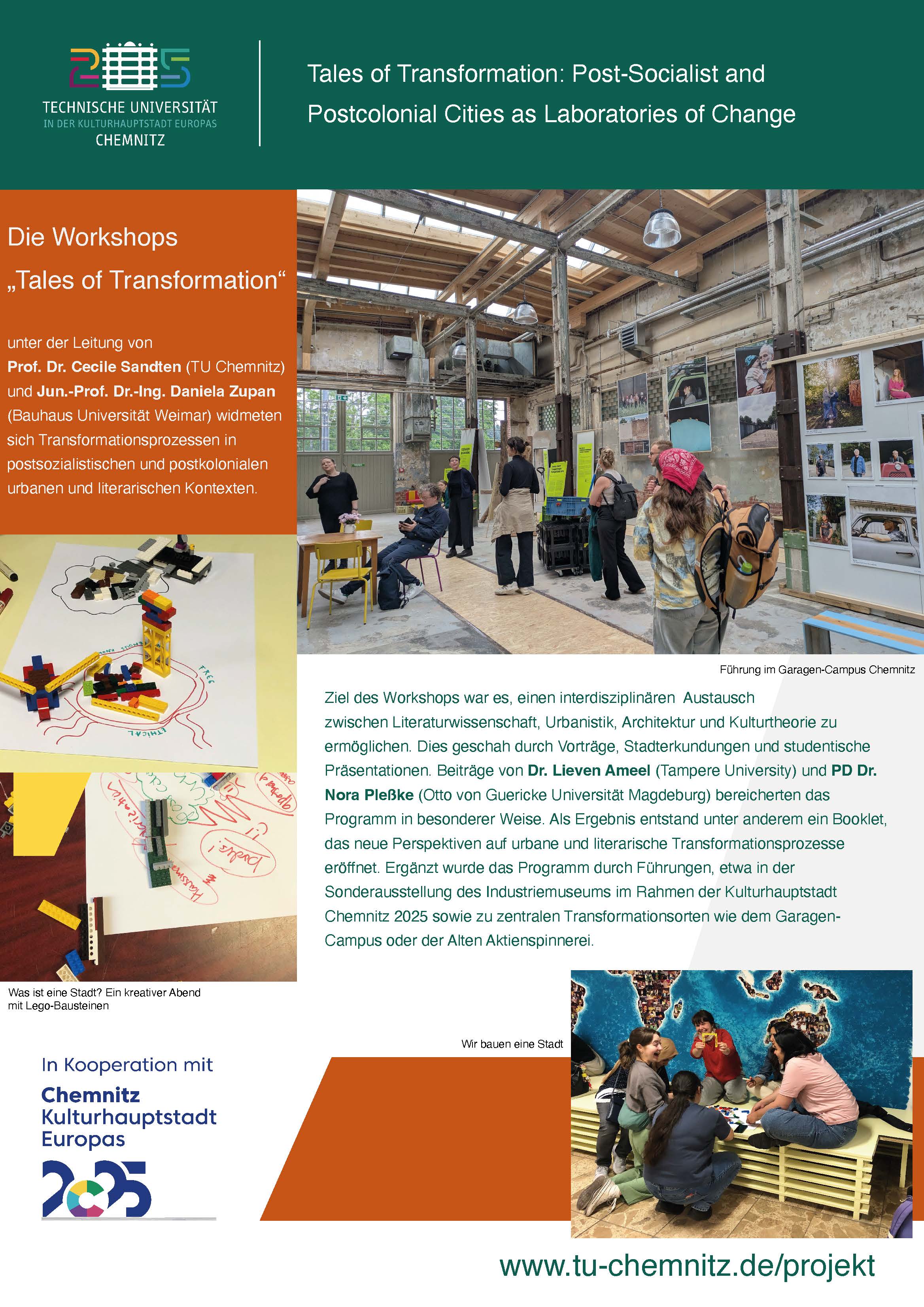 Die zweiteilige Workshop-Reihe, organisiert von Prof. Dr. Cecile Sandten (TU Chemnitz) und Jun.-Prof. Dr.-Ing. Daniela Zupan (Bauhaus-Universität Weimar), in Kooperation mit dem Industriemuseum Chemnitz und ALUS, fand im Rahmen zweier Masterseminare im Sommersemester 2025 statt. Der erste Workshop wurde in Weimar (8. – 9. Mai 2025), der zweite in Chemnitz (5. – 6. Juni 2025) durchgeführt. In Vorträgen, Exkursionen und kreativen Formaten wurde untersucht, wie städtischer Wandel in postsozialistischen und postkolonialen Kontexten erfahren und dargestellt wird.