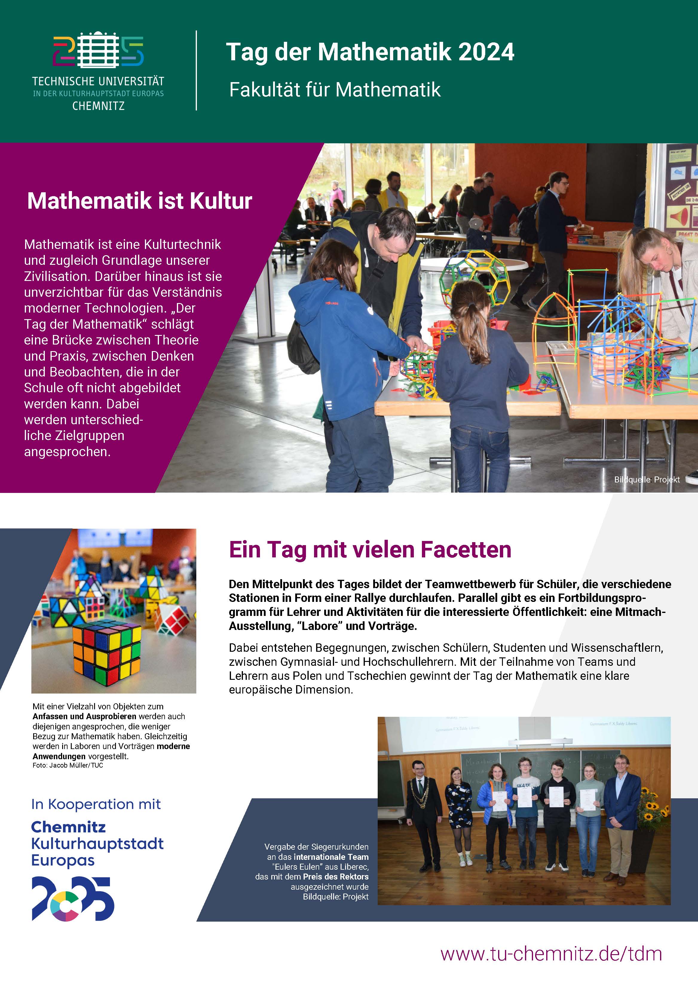 Ein Tag, an dem sich alles um Mathematik dreht und der zeigt, dass Mathe mehr ist als ein ungeliebtes Schulfach. Mathematik verbindet Theorie & Praxis, Denken & Beobachten, und steckt in so vielen Bereichen unseres Lebens, dass sie als Kulturtechnik nicht wegzudenken ist. Hauptevent ist der Team-Wettbewerb für Schüler:innen der Klassenstufen 8-9 und 10-12 mit Teilnehmenden aus (bisher) Sachsen, Tschechien und Polen. Während die Schüler:innen knobeln, finden Fortbildungsvorträge für Lehrer:innen, Referendar:innen und die interessierte Öffentlichkeit statt, die sich mit aktuellen Themen und Entwicklungen befassen. Dazu gibt es "Labore" mit besonderen mathematischen Problemen, die gelöst werden wollen, die beliebte Mitmachausstellung Mathematik für alle Altersgruppen und ein gemeinsames Vernetzungsmittagessen der angemeldeten Teilnehmenden. Auf den Hauptvortrag mit gesellschaftlich-kultureller Thematik folgt die Preisverleihung an die besten Teams.