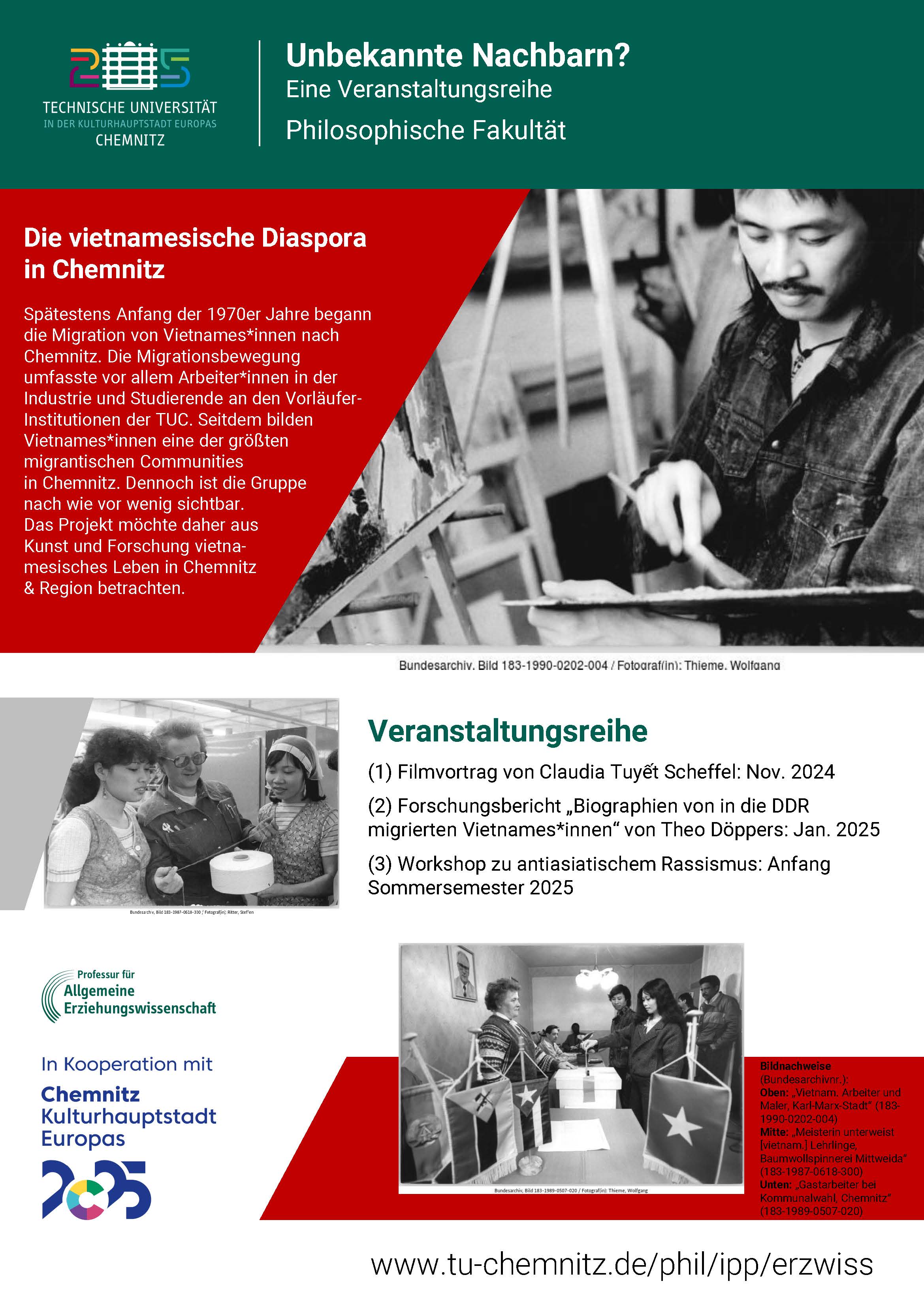 Die von der Professur Allgemeine Erziehungswissenschaft der TUC gemeinsam mit der Buchautorin und Regisseurin Claudia Tuyết Scheffel konzipierte Veranstaltungsreihe rückt transnationale Bildungsbiografien von Vietnames:innen in Chemnitz und in der Region in den Fokus. Zunächst wird die Forschung zu dieser bisher wenig thematisierten Gruppe unterstützt, u. a. durch biografische Interviews mit ehemaligen Studierenden der TU Chemnitz sowie mit ehemaligen sog. „Vertragsarbeiter:innen“ in der Region. Vorab des Kulturhauptstadtjahrs 2025 präsentieren die Projektverantwortlichen ihre Forschungsergebnisse im Rahmen einer Veranstaltungsreihe der breiten Öffentlichkeit.