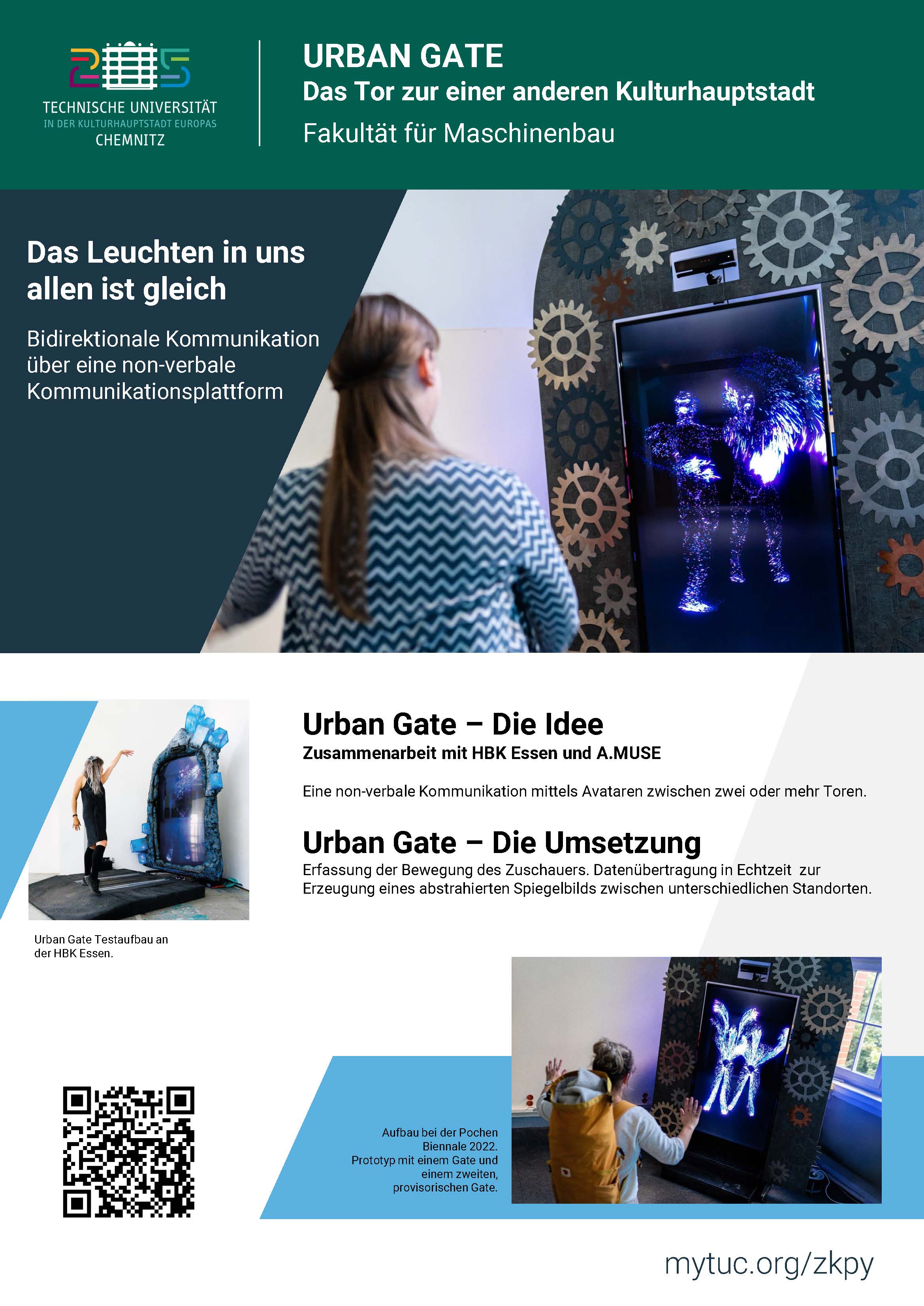 Die Professur für Produktionssysteme und -prozesse der TU Chemnitz plant, verschiedene ehemalige und aktuelle Europäische Kulturhauptstädte über interaktive, virtuelle Portale miteinander zu verbinden. Zusammen mit Studierenden der Hochschule der bildenden Künste Essen aus dem Studiengang Game Art & Design und dem Interactive Design Studio A.MUSE aus Halle wurden Portale entwickelt, die aus einer Tiefenkamera und einem Bildschirm bestehen und es ermöglichen, die Bewegungen der Anwender vor dem Portal aufzunehmen und auf dem anderen Portal anonymisiert wiederzugeben. In einem Kulturexperiment soll so gestenbasierte Kommunikation spielerisch genutzt werden, um eine Brücke zwischen ehemaligen und aktuellen Kulturhauptstädten oder Partnerstädten der Stadt Chemnitz zu errichten. Ein erster Prototyp wurde auf der Pochen Biennale 2022 aufgebaut und erhielt viel positives Feedback. Im Rahmen des Kulturhauptstadt-Programms soll das Portal 2025 langfristig im öffentlichen Raum aufgebaut werden.