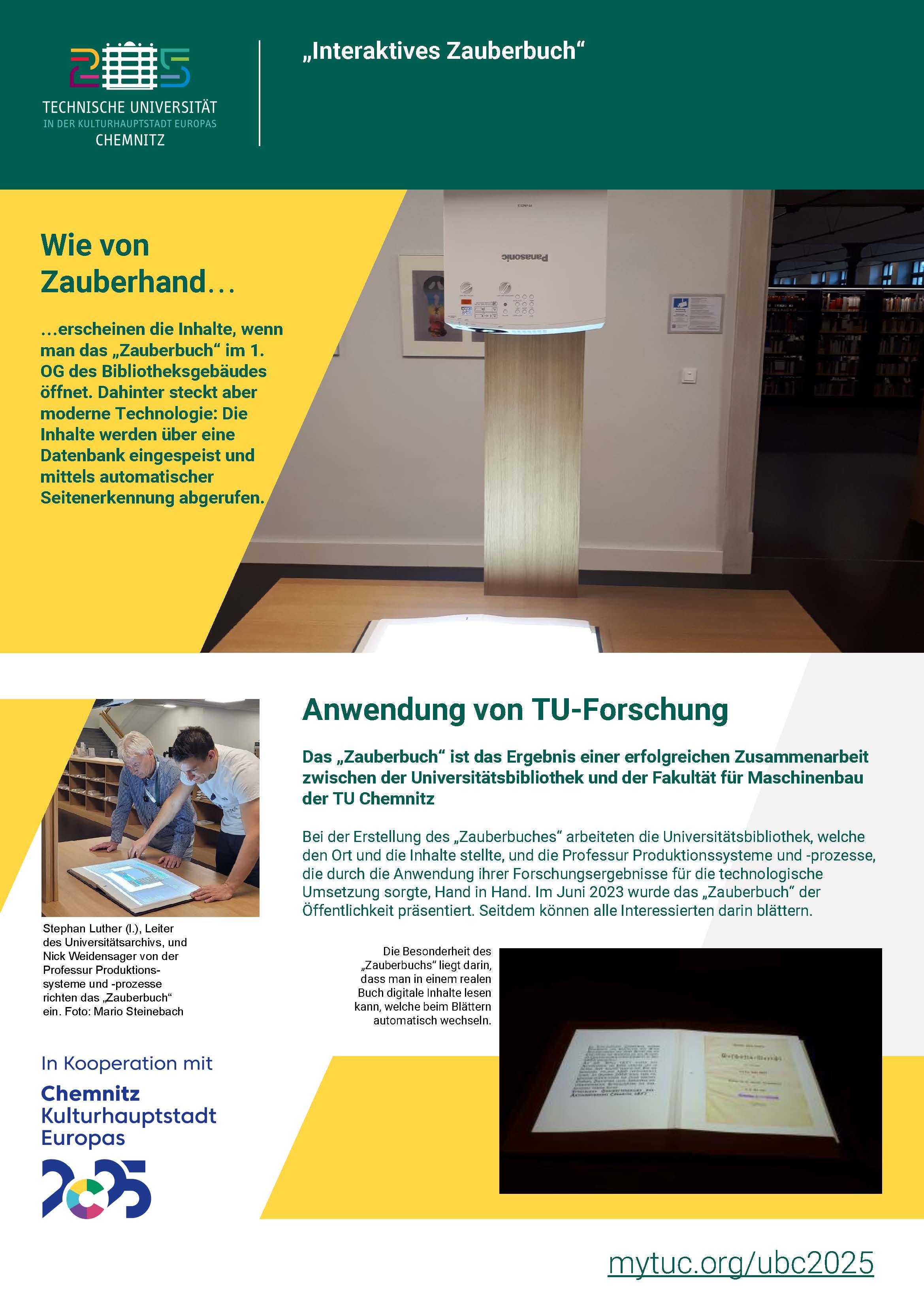 In dem Projekt der Universitätsbibliothek gemeinsam mit der Professur Produktionssysteme und -prozesse wurde ein „haptisches“ Buch mit datenbankbasierten wechselnden virtuellen Inhalten gefüllt. Dank Texterkennung werden diese automatisch der aufgeschlagenen Seite zugeordnet und „wie durch Zauberhand“ erscheint der jeweilige Text in laufender Schrift. Das durch Anfertigung eines passgenauen „Mobiliars“ auch optisch ansprechende „Zauberbuch“ wurde am 20. Juni 2023 der Öffentlichkeit präsentiert und ist seitdem allen Besuchenden der Universitätsbibliothek auf der Ausstellungsfläche im 1. Obergeschoss zugänglich. Befüllt ist es zunächst mit Inhalten zur Geschichte des Bibliotheksgebäudes („Alte Aktienspinnerei“) und seiner Nutzer.
