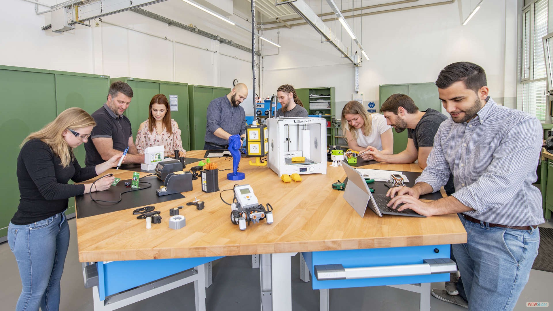 Hier wird gebohrt, gefräst, geklebt und gelötet. In der Werkstatt können auch Studierende ihr theoretisch erworbenes Wissen aus den Vorlesungen praktisch anwenden und z. B. konstruierte Vorrichtungen oder Bauteile bauen.