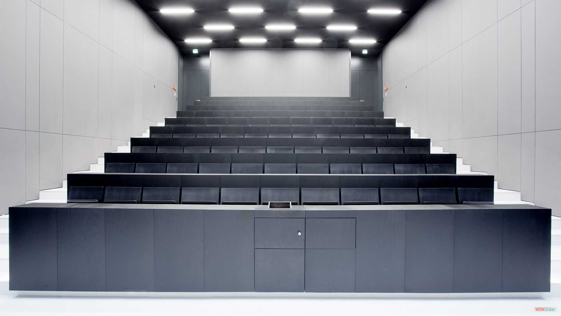 Im Weinholdbau findest du Hörsäle und Seminarräume, welche farblich dezent in Schwarz, Weiß sowie in verschiedenen Grautönen gehalten sind.