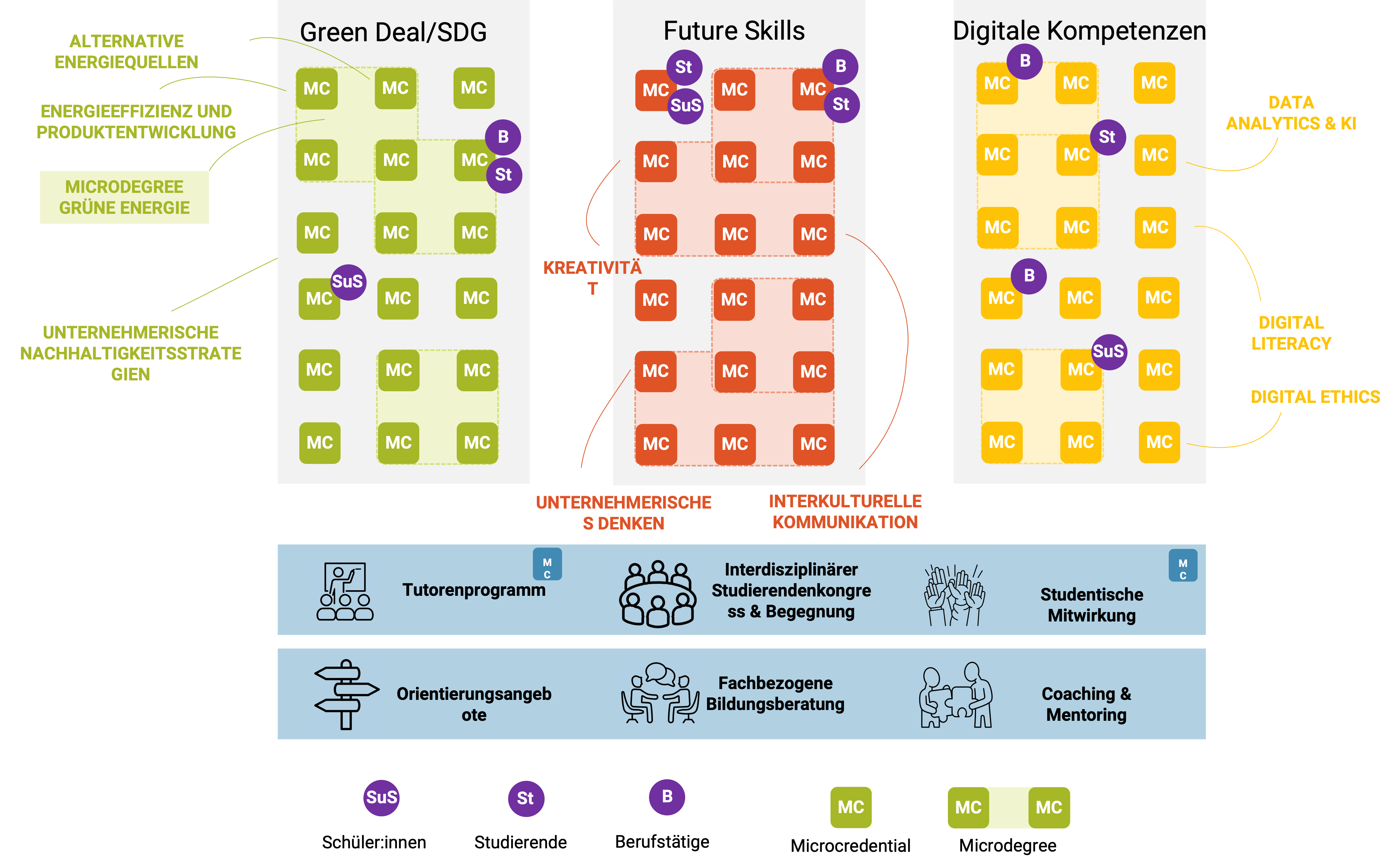 Das Projekt TUCadvance baut auf den Erfahrungen des Vorgängerprojekts TUCacademy auf und zielt darauf ab, durch innovative Bildungsformate den Studienerfolg zu steigern und die Fachkräftesicherung im Raum Sachsen zu unterstützen. Es fokussiert auf die Entwicklung und Einführung von Microcredentials und Microdegrees, die arbeitsmarktrelevante Kompetenzen, digitale Fähigkeiten sowie Nachhaltigkeit und die Ziele des Europäischen Grünen Deals fördern. Dafür werden die vorhandenen Strukturen genutzt und die Anzahl der Microcredentials und Microdegrees erhöht. Das Projekt TUCadvance legt besonderen Wert auf soziale Integration und die Unterstützung an Übergängen im Studien- und Karriereverlauf. Durch Community-Building-Maßnahmen werden Studierende zu aktiven Mitgestaltenden ihrer Lernumgebung, was ihre soziale Integration und Bindung an die Region verbessert. Das Transition Counseling unterstützt gezielt Übergänge zwischen Studienphasen und Karriereschritten und bietet insbesondere für Frauen Möglichkeiten zur individuellen Karriereplanung und Persönlichkeitsentwicklung.