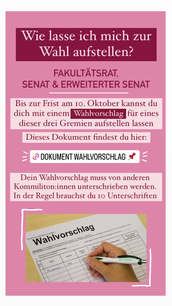 Den ausgefüllten Wahlvorschlag musst du nun noch fristgerecht beim Wahlamt der TU Chemnitz (Uniteil Straße der Nationen) abgeben. Wenn alle Formalitäten passen, dann steht dein Name für die kommende Wahl auf dem Stimmzettel.