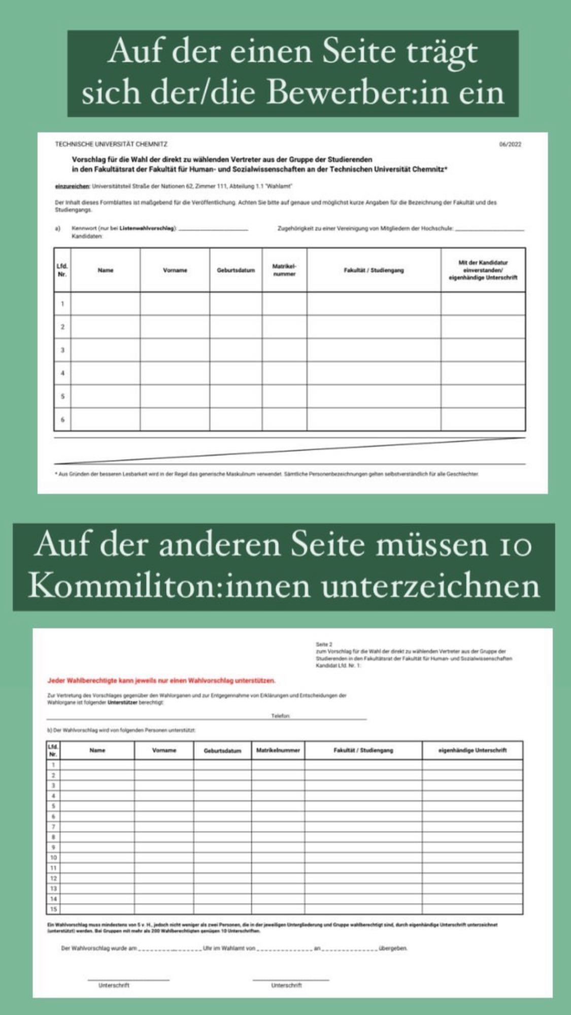- Um dich zur Wahl aufstellen zu lassen, müssen einige deiner Kommiliton:innen dem Vorschlag „zustimmen“. Das tun sie, indem sie sich in die entsprechende Tabelle auf der Rückseite deines Wahlvorschlags eintragen und unterschreiben.