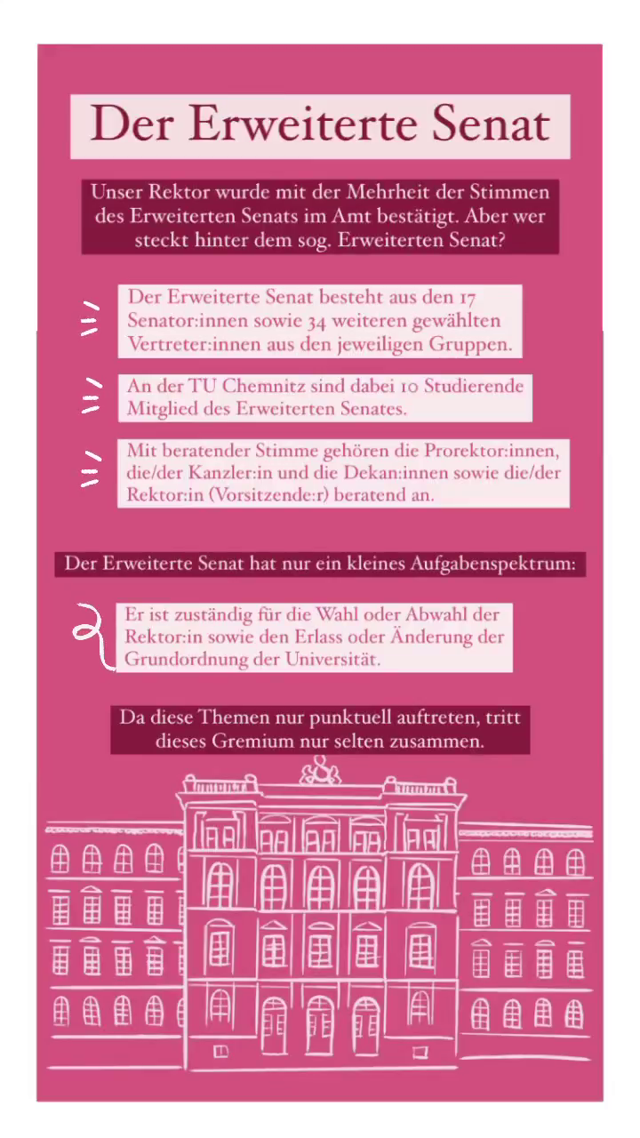 Auf unserem Instagramaccount @tucpanel haben wir dazu ein Interview mit Thomas geführt, der von seinen Erfahrungen als studentischer Senator an der TU Chemnitz berichtet: