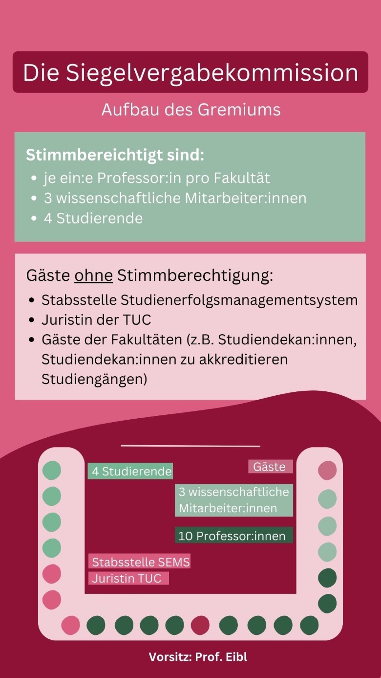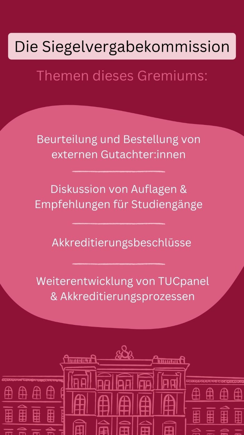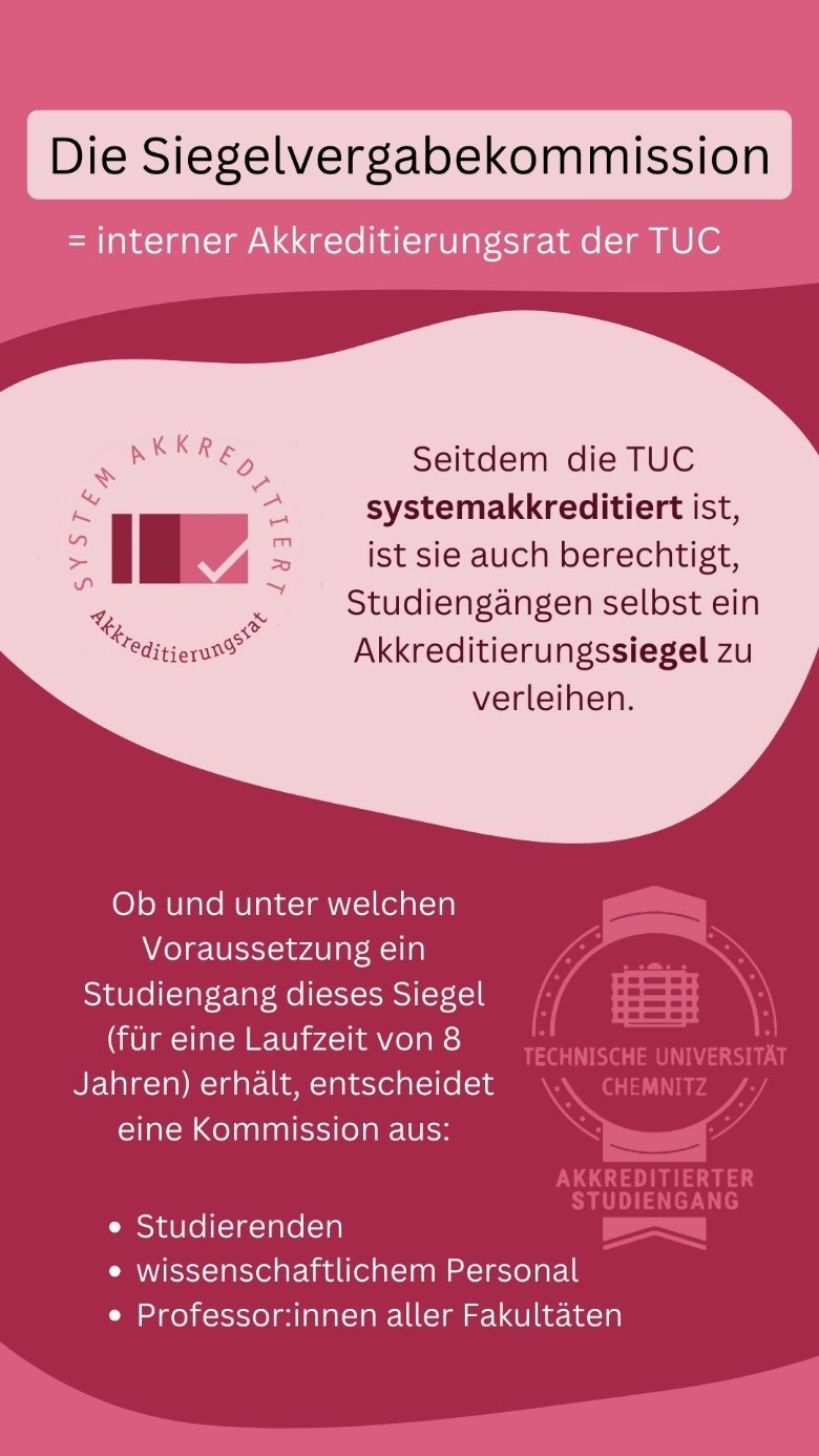 An der TUC schauen wir uns mit der Siegelvergabekommission die einzelnen Studiengänge ganz genau an: Die Studiengangverantwortlichen basteln viele Monate an den Studiendokumenten, danach schaut sich ein externes Gutachtergremium den Studiengang an und spricht mit den Studierenden vor Ort. Die Gutachter*innen (darunter auch ein*e Studierender) fassen im Anschluss an die Begutachtung ihre Eindrücke in Weiterentwicklungsempfehlungen und Auflagen zusammen. Die Siegeivergabekommission ist dann die letzte Instanz, die über diese Empfehlungen und Auflagen diskutiert und diese dann final beschließt. Alle Details zu den Tätigkeitsbereichen der SVK findest du hier.