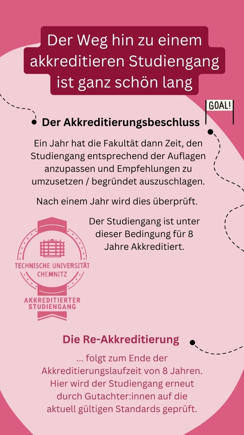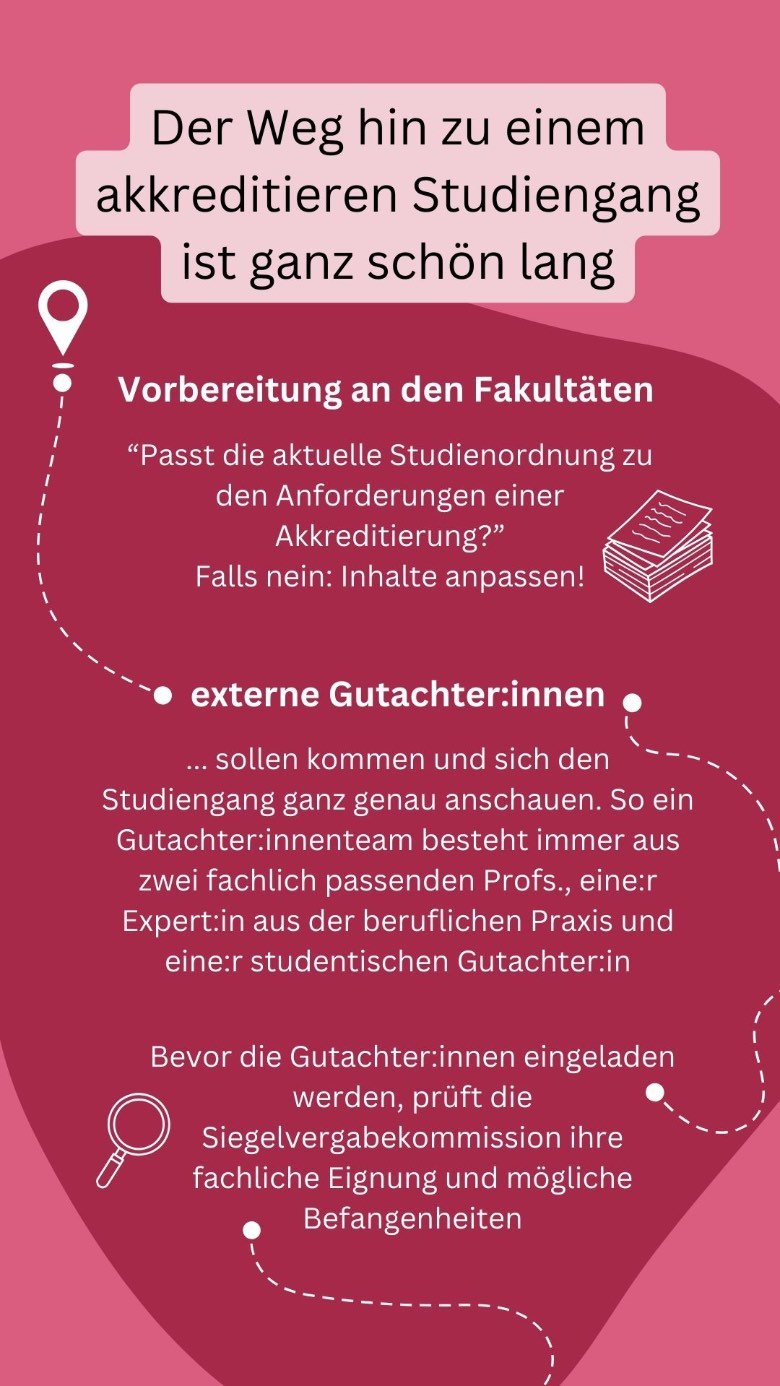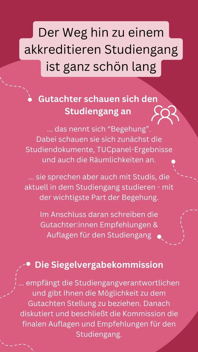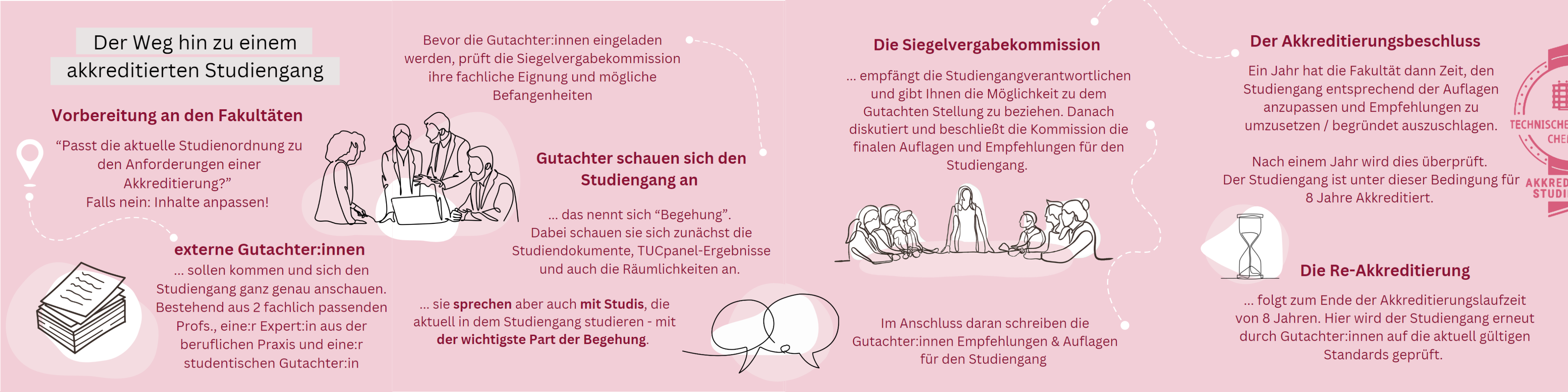 An der TUC schauen wir uns mit der Siegelvergabekommission die einzelnen Studiengänge ganz genau an: Die Studiengangverantwortlichen basteln viele Monate an den Studiendokumenten, danach schaut sich ein externes Gutachtergremium den Studiengang an und spricht mit den Studierenden vor Ort. Die Gutachter*innen (darunter auch ein*e Studierender) fassen im Anschluss an die Begutachtung ihre Eindrücke in Weiterentwicklungsempfehlungen und Auflagen zusammen. Die Siegeivergabekommission ist dann die letzte Instanz, die über diese Empfehlungen und Auflagen diskutiert und diese dann final beschließt. Alle Details zu den Tätigkeitsbereichen der SVK findest du hier.