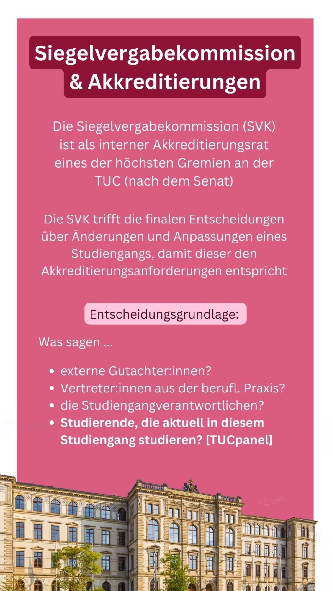 Die Siegelvergabekommission (kurz: SVK) ist ein Gremium an der TUC, welches für die sog. "Akkreditierung" von Studiengängen zuständig ist. Mit einer Akkreditierung wird einem Studiengang bescheinigt, dass er europaweit gültigen Standards entspricht. Dadurch sollen Studiengänge hochschulübergreifend (selbst über Landesgrenzen hinweg) vergleichbar werden und so auch einen Wechsel der Uni oder Anrechnung aus dem Ausland erleichtern. Die Grundidee der Akkreditierung stammt aus der Bologna-Reform, die damals auch das Bachelor- und Mastersystem eingeführt hat.