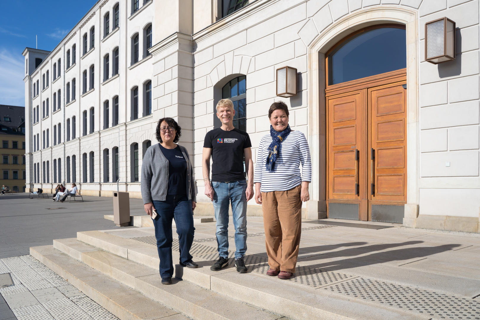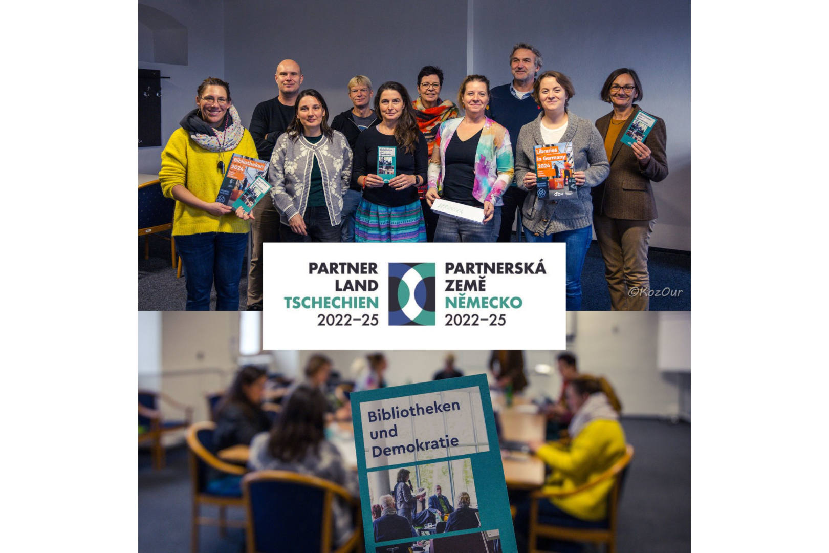 Die Universitätsbibliothek Chemnitz nahm an der Partnerlandinitiative Deutschland-Tschechien des Deutschen Bibliotheksverbandes teil. Im Rahmen dessen fand vom 11.-13.11.2024 ein Vernetzungstreffen mit der tschechischen Gruppe in Chomutov statt. Am 12.11.2024 wurden Bibliotheken in der deutschen Grenzregion besucht, u.a. die Universitätsbibliothek Chemnitz. 2024 © Fotomontage: Martina Kožíšek Ouřadová (Stadtbibliothek Pilsen) -