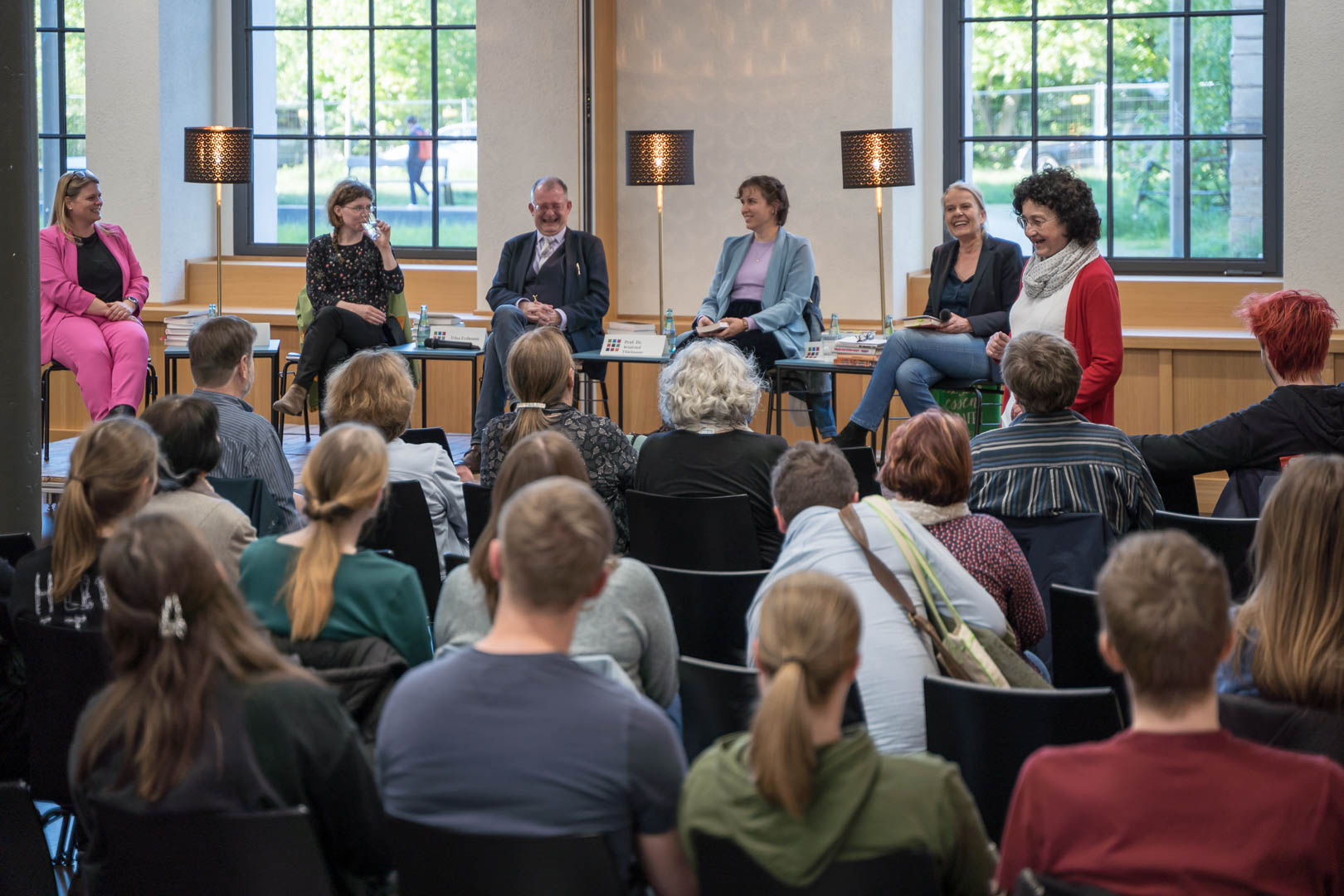 Das 24. Literarische Quintett mit Prof. Veronika Karnowsk, Irina Erdmann, Prof. Winfried Thielmann, Elisa Weißer und Prof. Bernadette Malinowski (v.l.), 2025 © Tino Riedel (UBC) -
