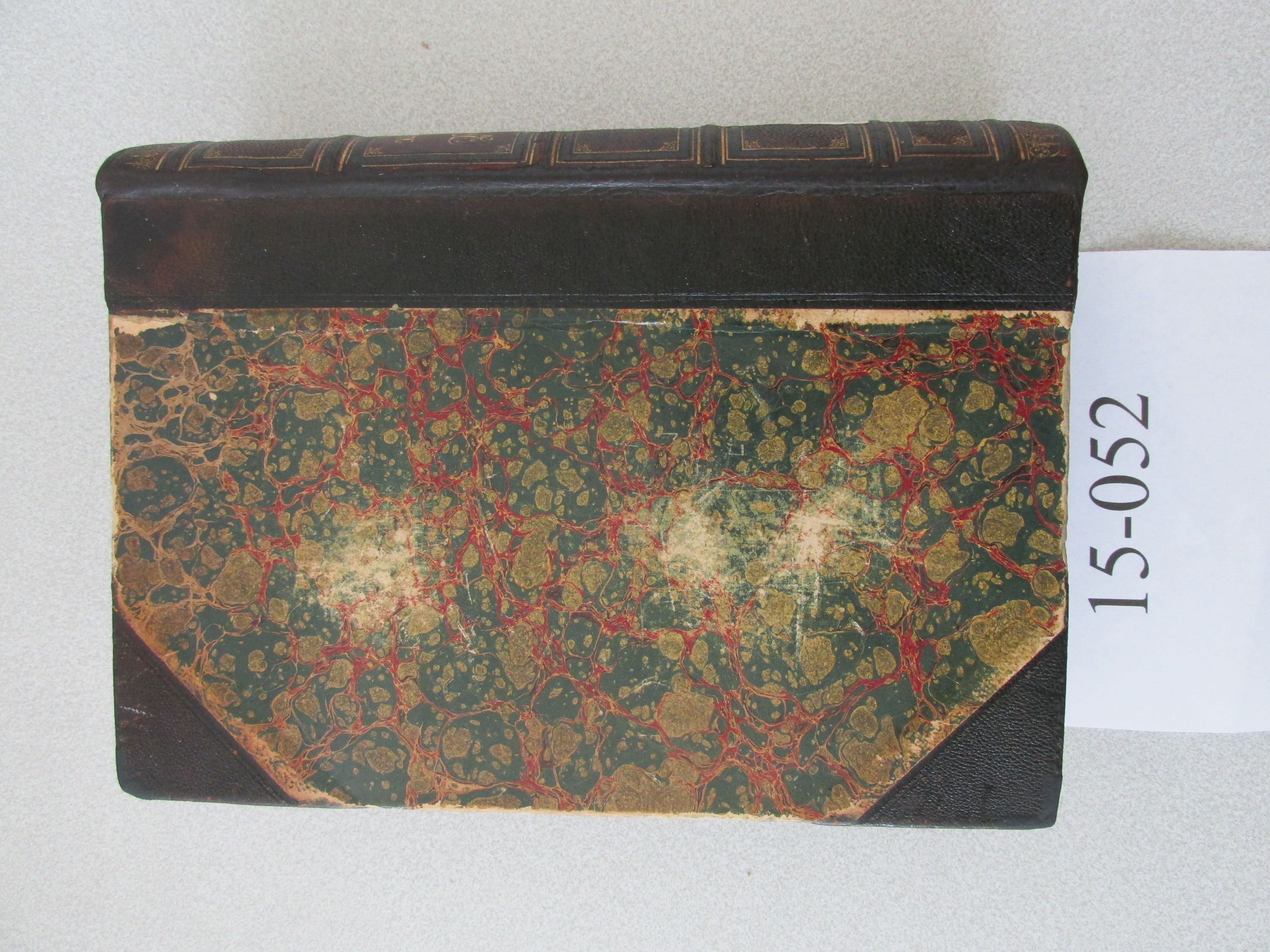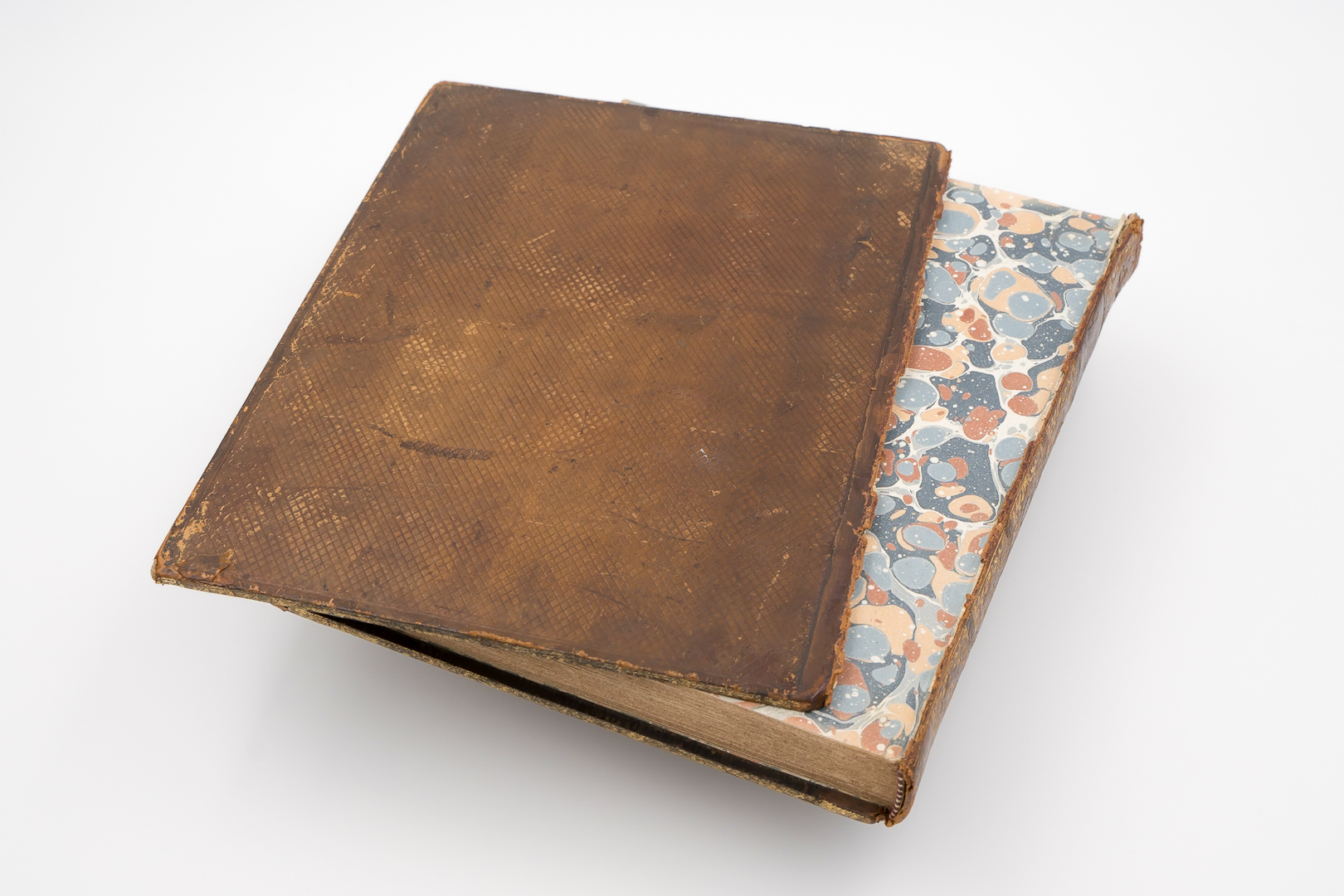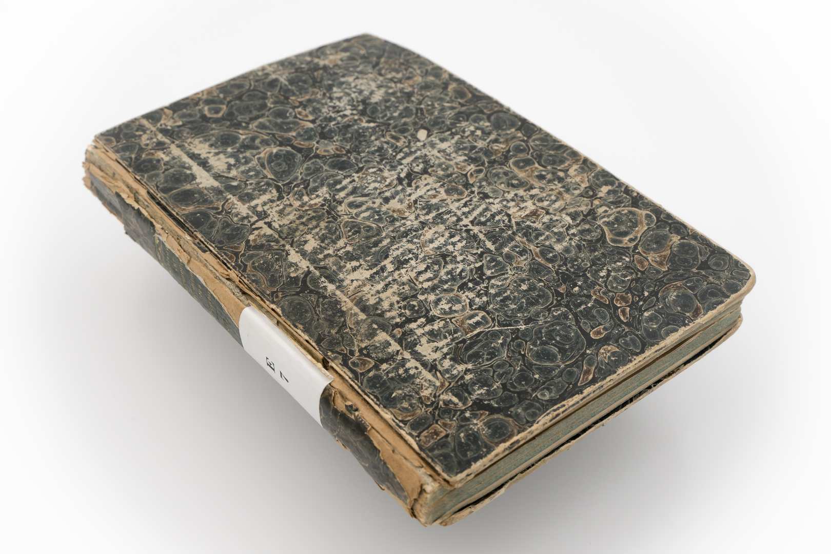 Erfolgte Maßnahmen: Trockenreinigung, Lösen des Einbandes, Stabilisierung der Heftung, Einbandrestaurierung