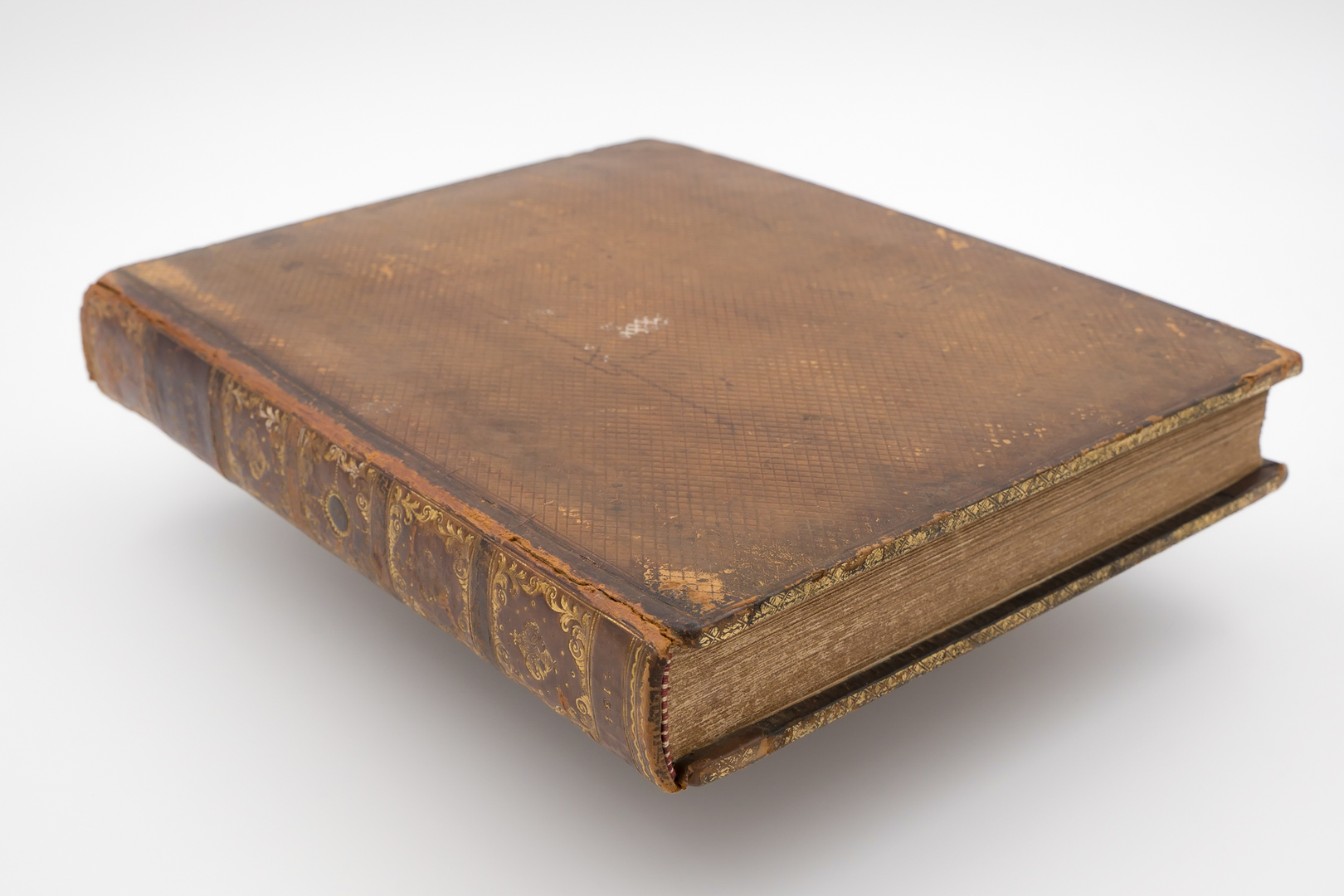 Erforderliche Maßnahmen: Trockenreinigung, Stabilisieren des Buchblocks, Einbandrestaurierung