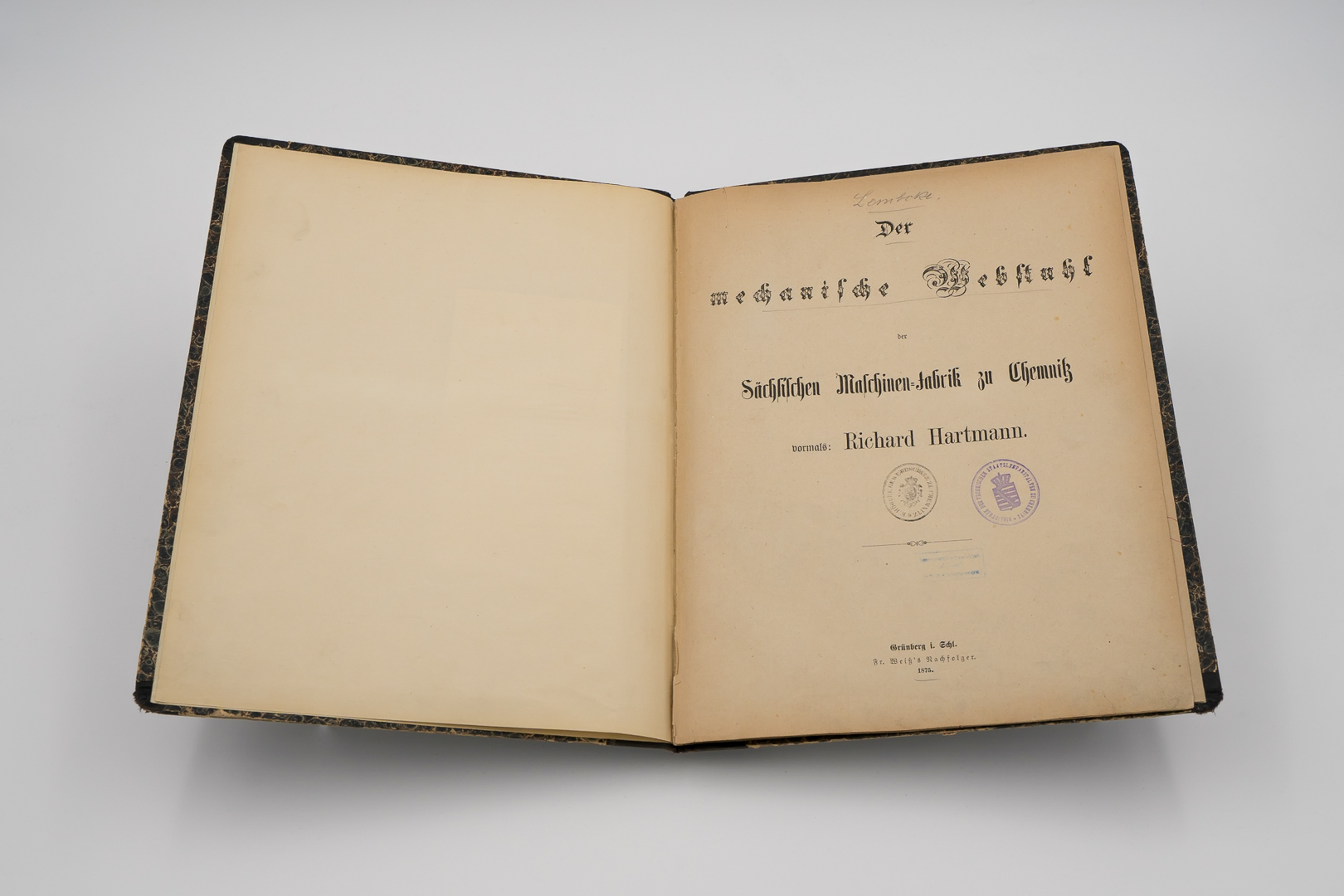 Zum Werk: [40] S. handschriftl. : 14 Bl. Zeichnungenber: Transmission; Tafel zur Transmissions-Berechnung; Stuhlwand; Details z. Hartmann'schen Revolver-Stuhl; Lade nebst Theilen; Regulator; Der Schlag; Seitenansicht u. Theile der 18 schäftigen Schemelschaftmaschine (System R. Hartmann).