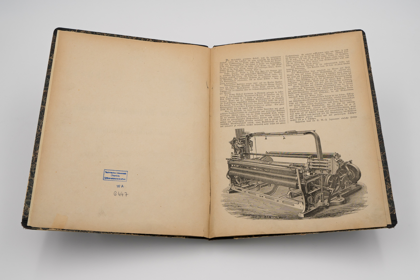 Zum Werk: J. G. Bartsch war Lehrer an der berühmten Wiener (Porzellan-) Manufaktur (Kaiserlich privilegierte Porcellain Fabrique). Gegründet 1718, sie bestand bis 1864. Der Atlas enthält neben zahlreichen Abbildungen von Webstühlen, deren Details, eine Vielzahl von Vorlagen für Ornamente, Druck- und Stoff-Muster. Insgesamt 15 Tab., 34 Taf., 120 Stoffproben. Er sollte die verschiedenen Webstuhlsysteme der beiden Textbände (WA: G 14-1; WA: G 14-2) veranschaulichen und den Schülern einen Überblick über den mechanischen Webstuhlbau mit seinen Besonderheiten geben. Der Band ist ein schönes Beispiel für den Erwerb von pragmatischer „Fachliteratur“ durch die Bibliothek in der Gründungsphase der Königlichen Gewerbschule zu Chemnitz. Er befand sich zunächst im Bestand der mechanischen Baugewerkenschule- und Werkemeisterschule zu Chemnitz, war beim Verlag und der Steindruckerei von Alois Leykum (1801-1855) in Wien erschienen. Die Lithographien der Tabellen und Tafeln wurden von Eduard von Kiszelenyi (1811 -1847) und Franz Feid angefertigt.