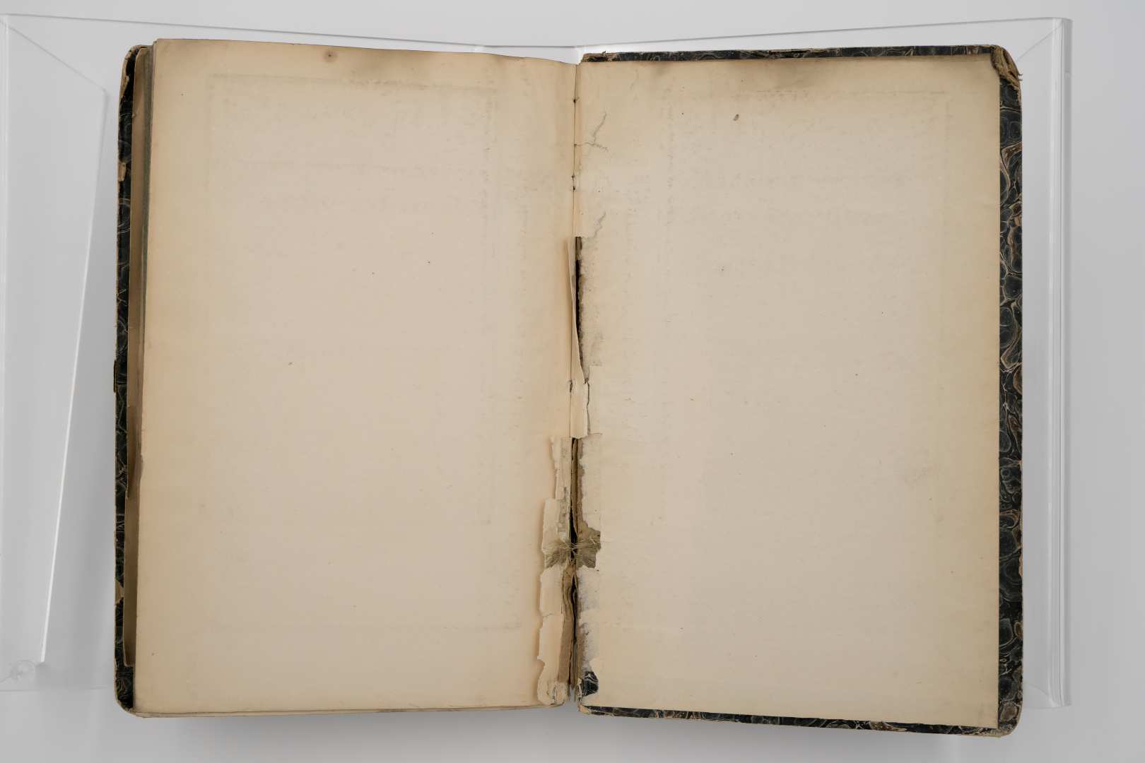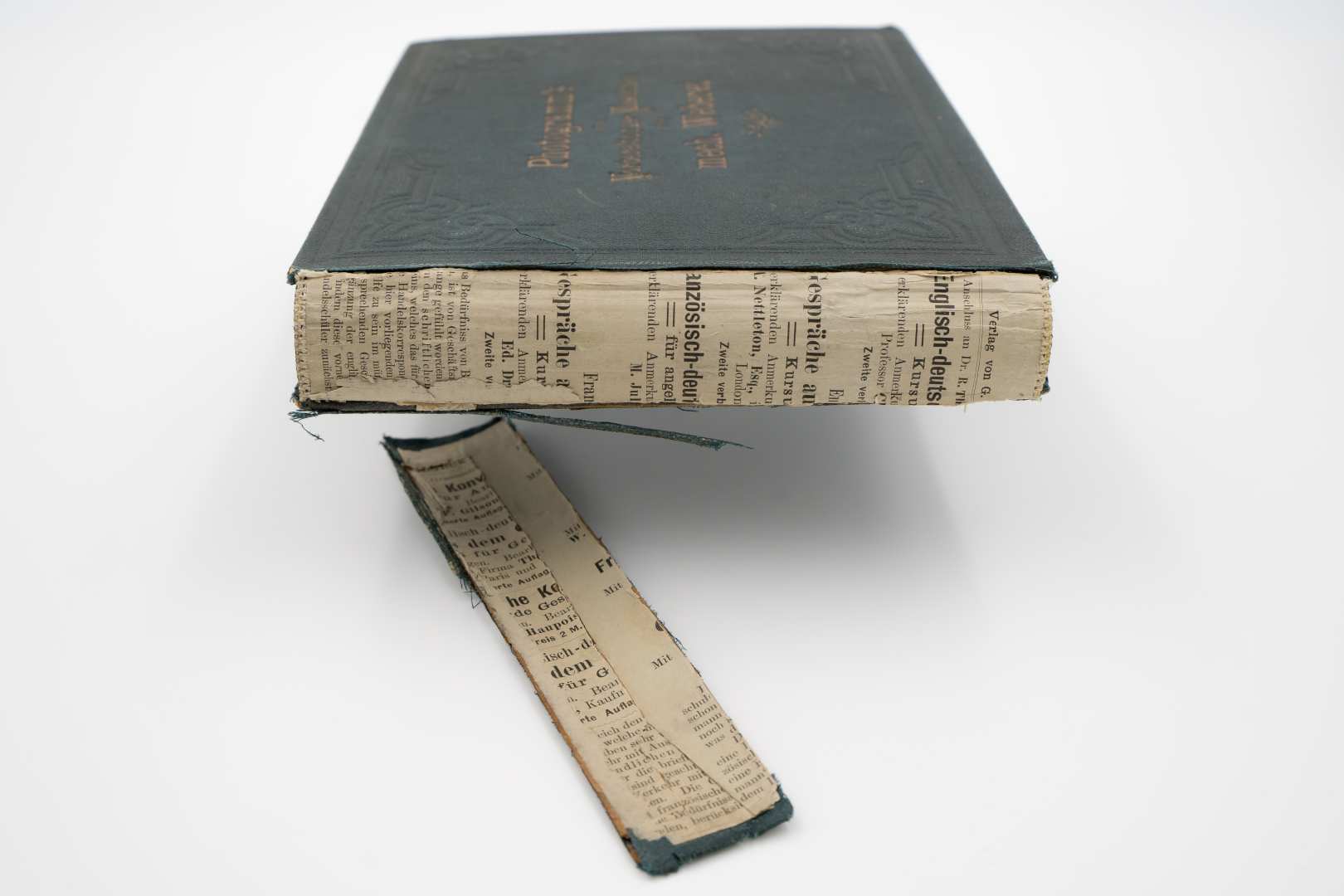 Erfolgte Maßnahmen: Trockenreinigung, Stabiblsieren der Heftung, Falz- und Einbandrestaurierung