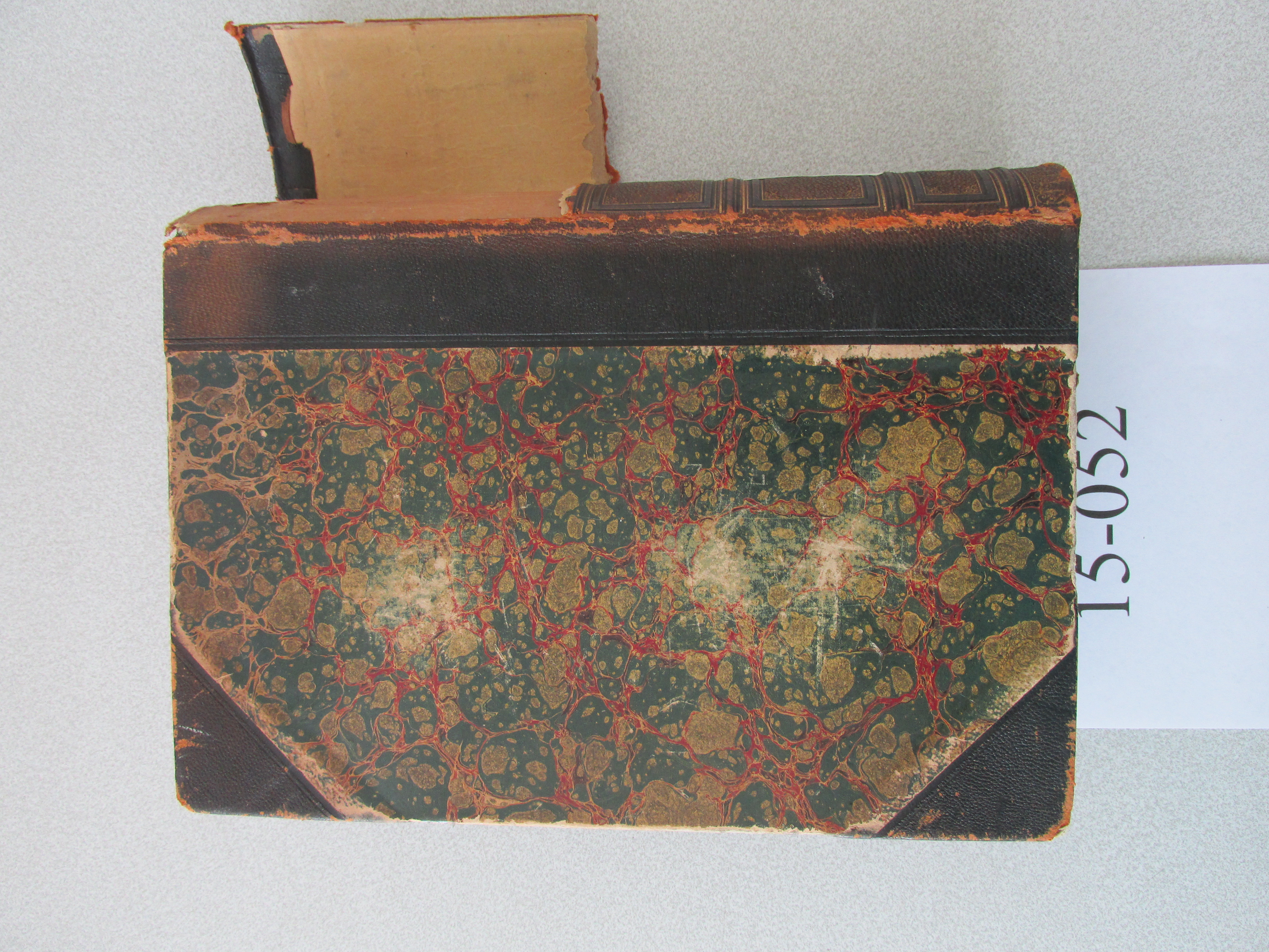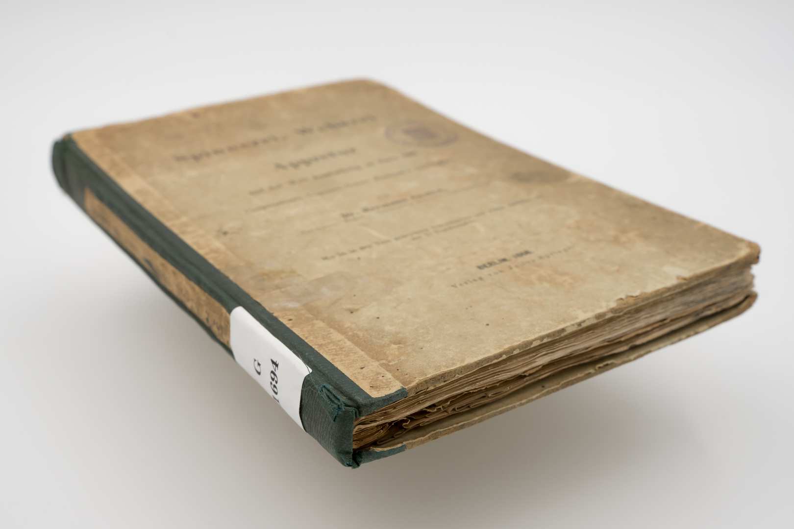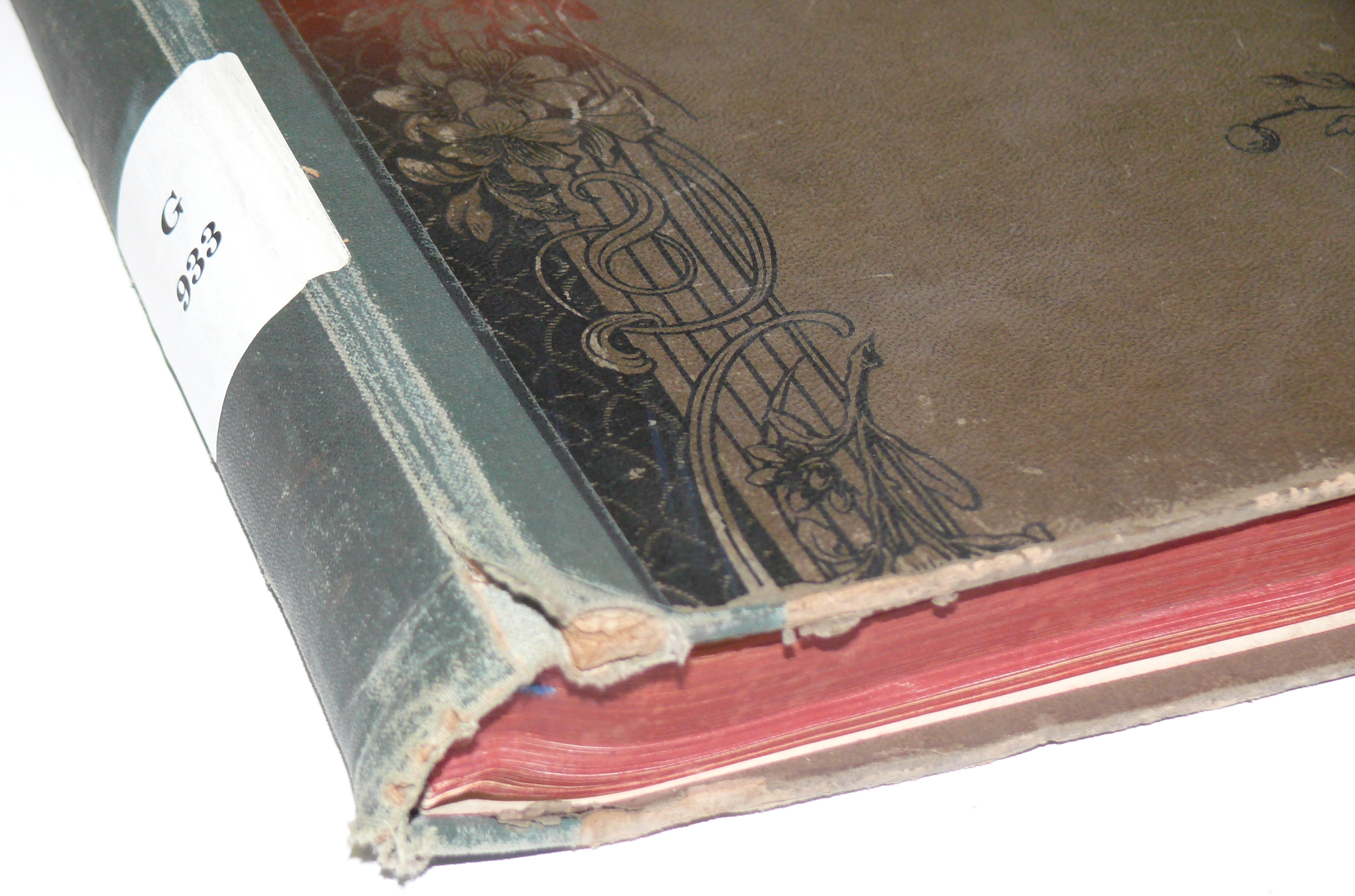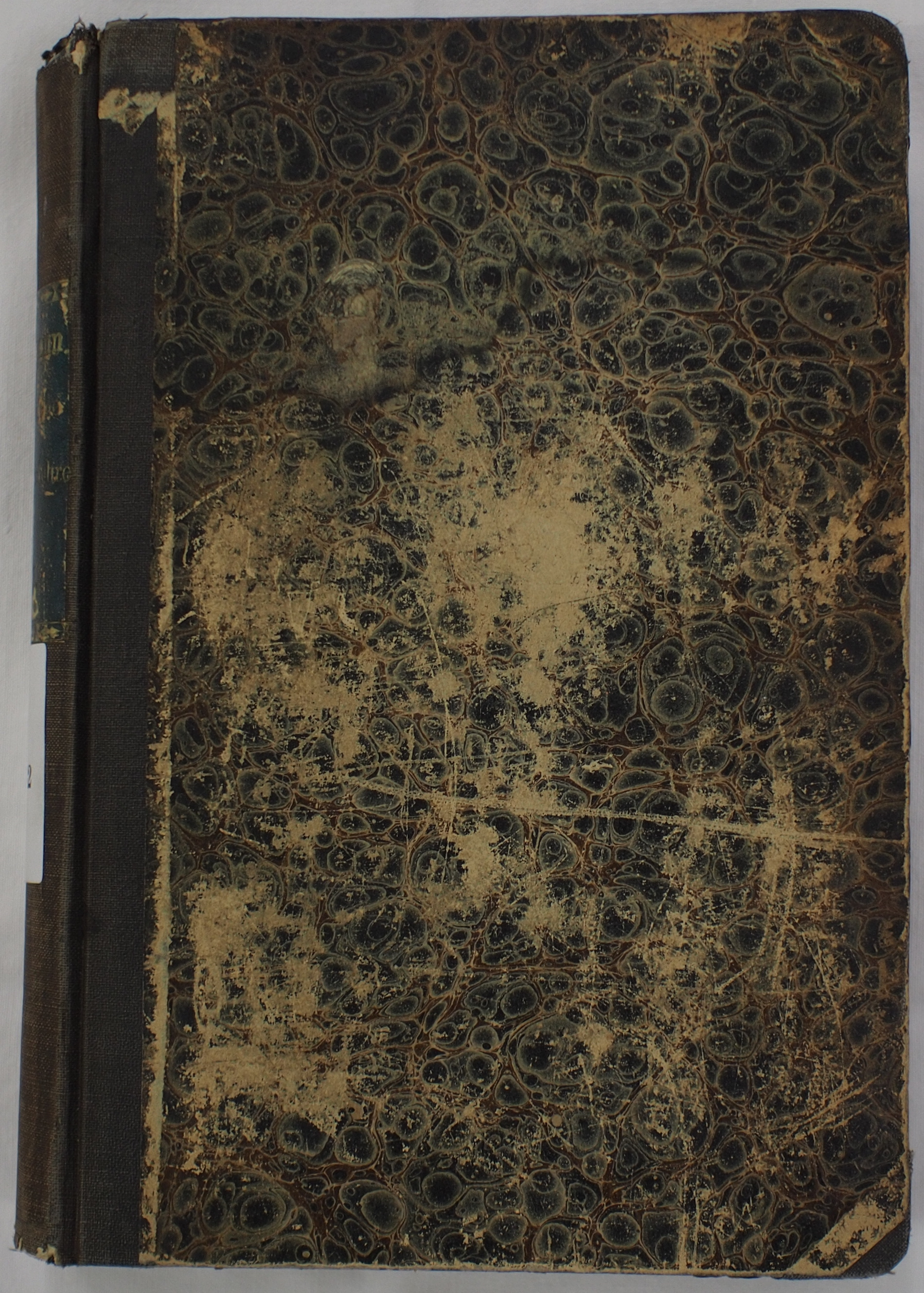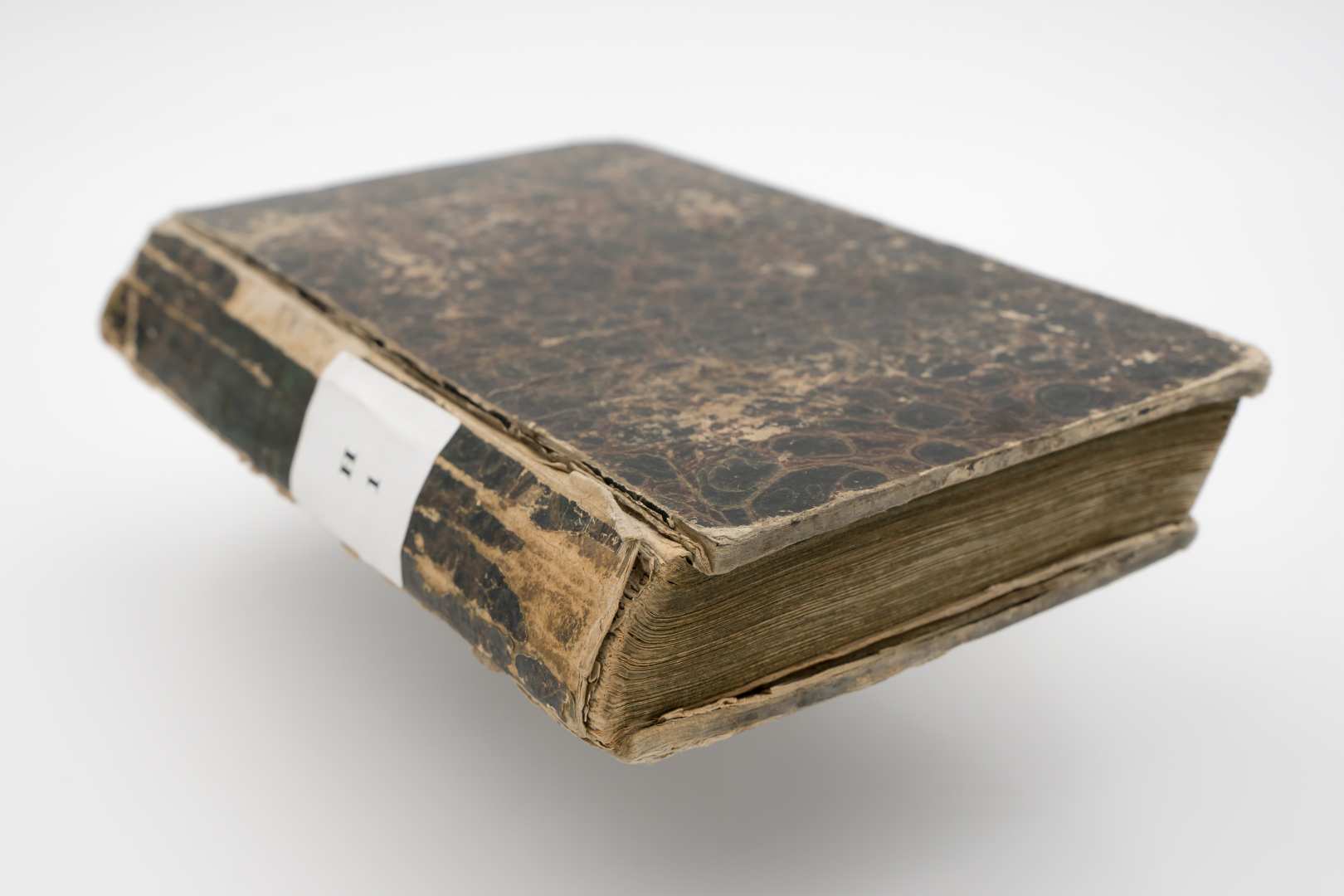 Erfolgte Maßnahmen: Trockenreinigung, Stabiblsieren des Einbandes, Einbandrestaurierung