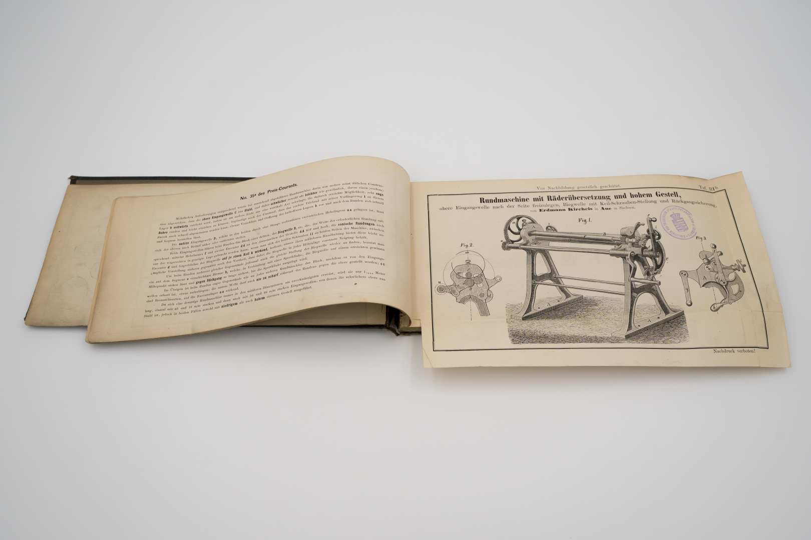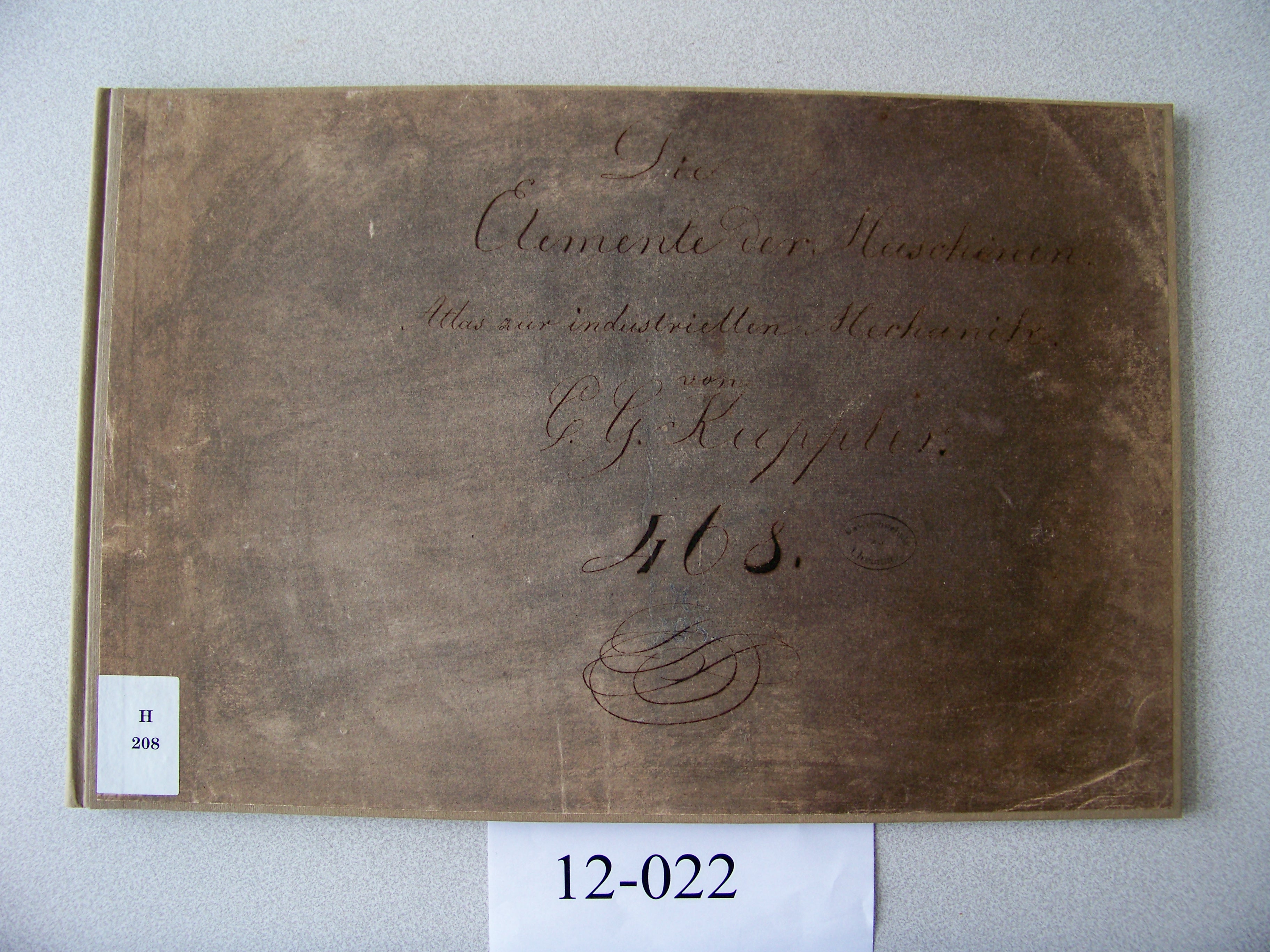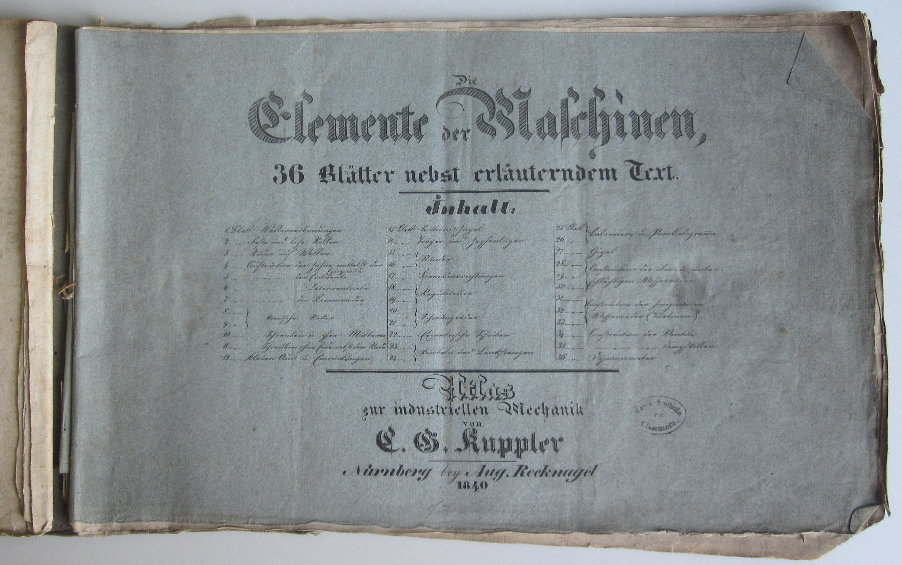 Zum Werk: Der Atlas "Die Elemente der Maschinen", erschienen 1840, war Teil eines Handbuchs zur "Industriellen Mechanik", das von Conrad Georg Kuppler (Professor für darstellende Geometrie, Mechanik u. Maschinenlehre an der Königl. Polytechnischen Schule zu Nürnberg) verfasst wurde, unter Vorlage der Arbeiten Jean-Victor Poncelets. Die aufgenommenen Abbildungen umfassen en detail alle damals für wesentlich erachteten Maschinenteile, so z.B. Zahnräder, Übertragungswellen etc.