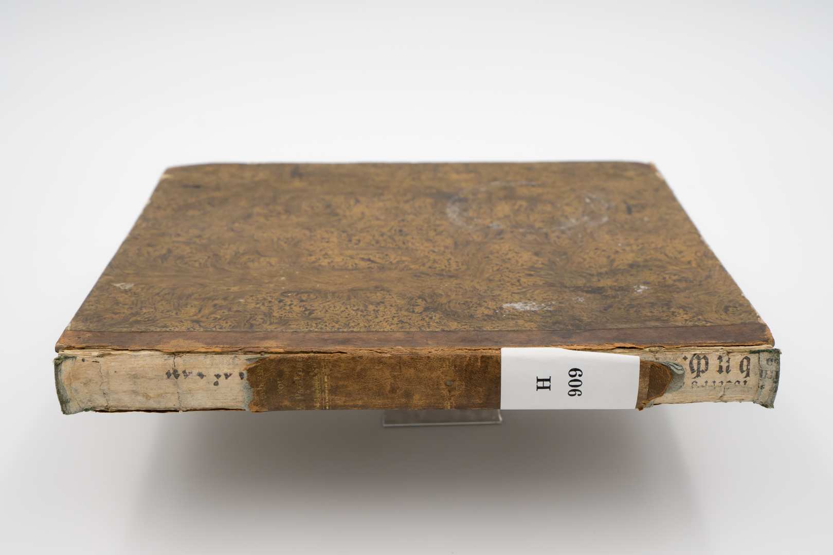 Erfolgte Maßnahmen: Trockenreinigung, Lösen des Einbandes, Sicherung der Heftung, Anfertigung eines neuen Einbandes unter Verwendung der historischen Bezugsmaterialien