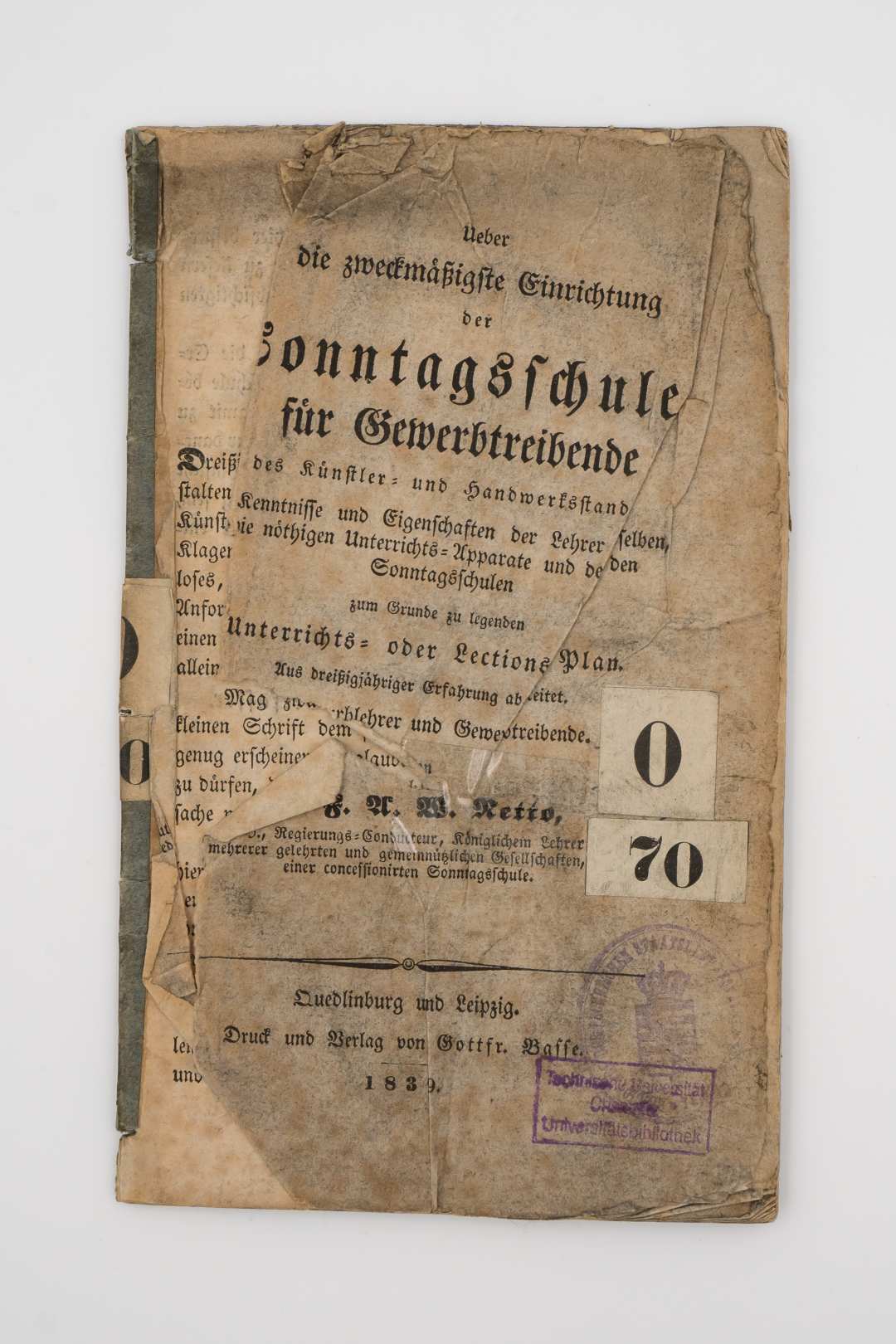 Zum Werk: "Dreißigjährige Erfahrung als Lehrer an solchen Anstalten“ und „oftmals vernommene Klagen von gewerbetreibenden Eltern, reges, aber zweckloses Streben von Jünglingen, um den gesteigerten Anforderungen zu genügen, welche unsere Tage auch an einen jeden Gewerbetreibenden machen“ haben den „Verfasser“ zur Abfassung dieses Leitfadens veranlasst. „Sollte man aber an irgendeinem Orte die Errichtung einer Sonntags- oder einer Gewerbsschule beabsichtigen und den Verfasser vertrauensvoll damit beauftragen“, so wäre dieser „zu allen Zeiten so bereit als willig […] dem geschenkten Vertrauen ehrenvoll zu entsprechen.“ Es handelt sich also hier nicht nur um eine theoretische Schrift, sondern durchaus ebenso um eine Bewerbung, die Empfehlungen auch praktisch umzusetzen. Für die Chemnitzer Einrichtung kamen diese 3 Jahre zu spät, aber vielleicht hat sich „der Verfasser“ ja davon inspirieren lassen…