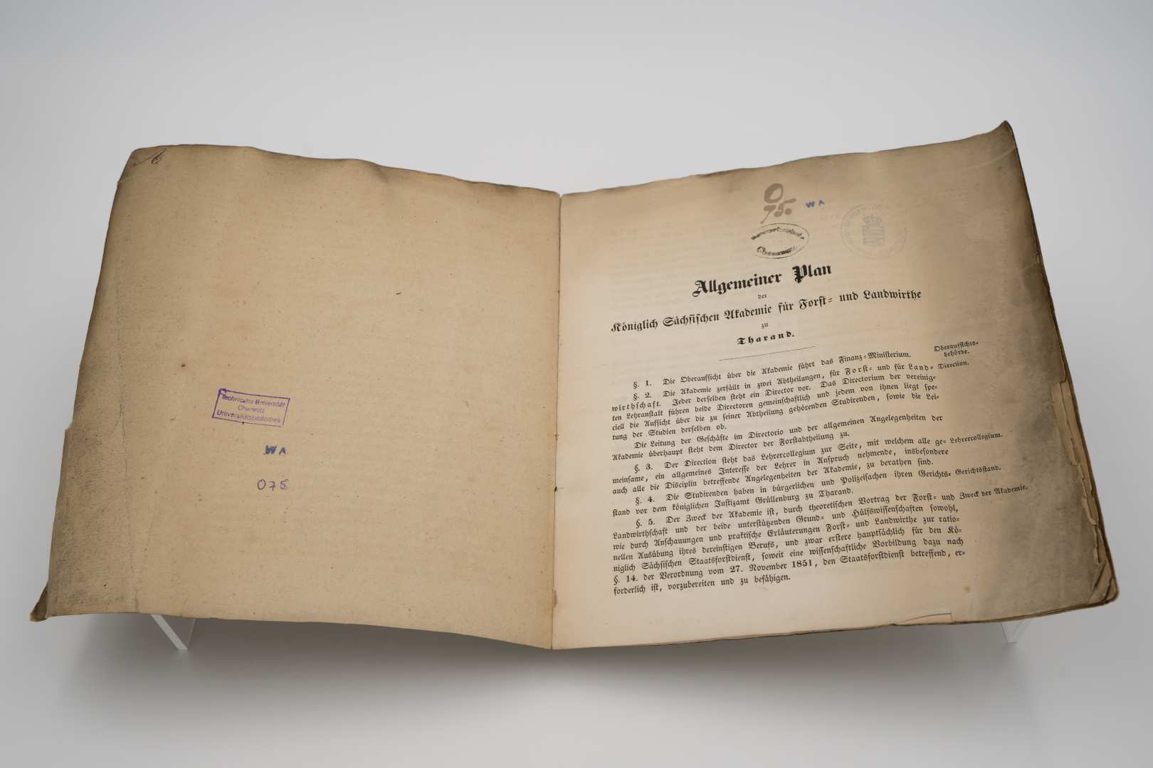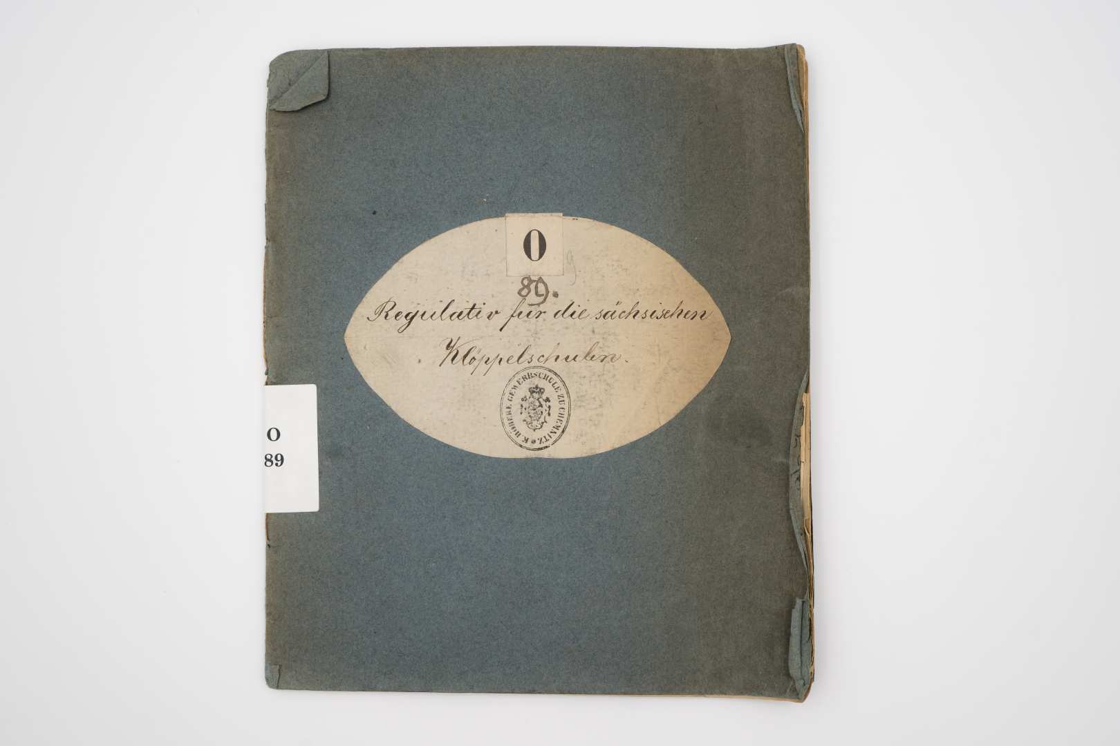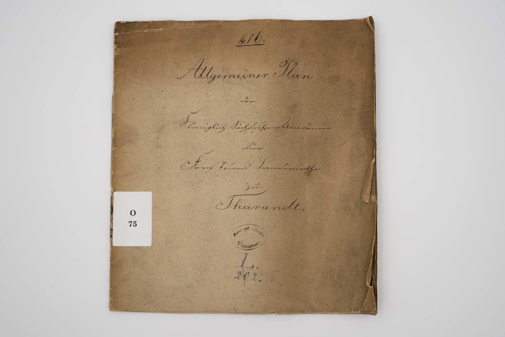 Erforderliche Maßnahmen: Trockenreinigung, Schließen von Rissen, Anfertigung einer neuen Mappe analog des Originals unter Verwendung des historischen Titelschildes