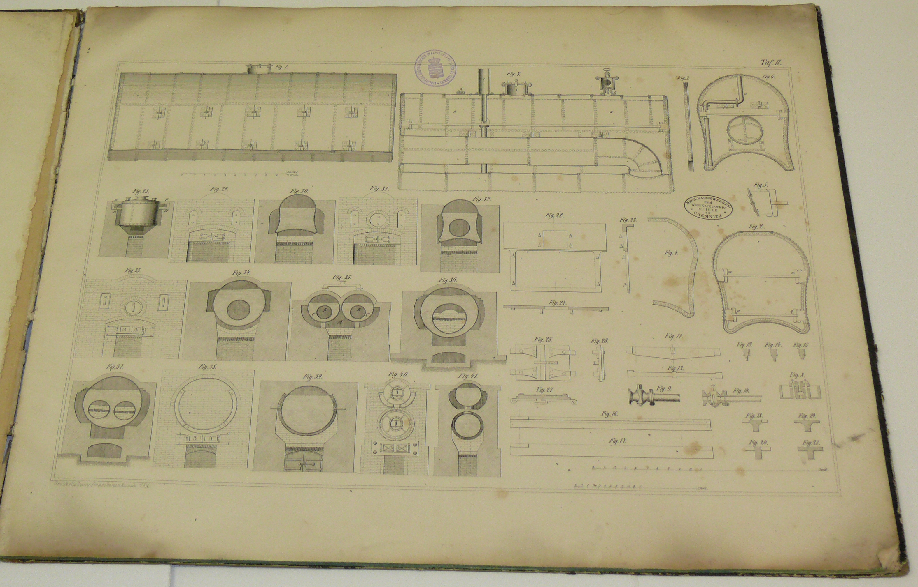 Zum Werk: Carl Friedrich Alexander Hartmann, auch Karl Friedrich Alexander Hartmann oder Carl Hartmann, (1796 - 1863) war ein dt. Mineraloge, Hütteningenieur und Schriftsteller. 1841 gab er seine Laufbahn als Bergbaukommissar auf, ging über Berlin und Weimar nach Leipzig und widmete sich ausschließlich der Schriftstellerei. Jedes Jahr erschienen umfangreiche Lehr- u. Wörterbücher zu naturwissenschaftlichen und technischen Themen. 1842 begründete er die Berg- und Hüttenmännische Zeitung. Darüber hinaus übersetzte er zahlreiche Werke aus der englischen und französischen Sprache. Beide Atlanten (WA H 148-3, WA H 148-4) enthalten technische Zeichnungen zu zeitgenössischen Dampfmaschinen und Lokomotiven sowie Detail-Pläne zu diversen Maschinen-Elementen.
