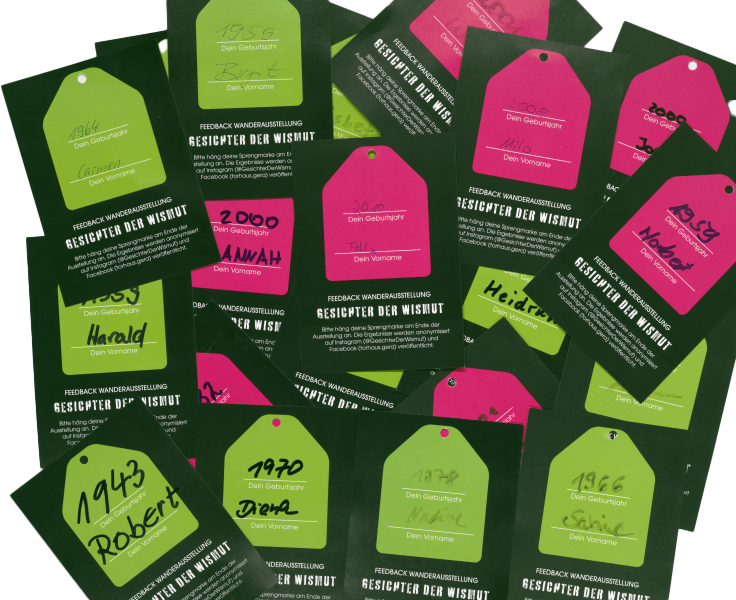 Egal ob man alte Schachtanlagen, Straßennamen, Wohnarchitektur, individuelle Familienbiografien oder Erinnerungen und Traditionen in den Blick nimmt: Die Wismut in Ostthüringen hatte viele Gesichter! Für die Wanderausstellung „Gesichter der Wismut“ begaben sich junge Menschen aus Ostthüringen auf Spurensuche: In Gesprächen mit Zeitzeug:innen sammelten persönliche Anekdoten und Rückschauen auf Lebenswege. Sie stießen auf Brigadetagebücher, Urlaubsfotos, Restaurant-Karten, Propaganda, Punk-Songs, vermeintlich unberührte Natur und Zeugnisse alter Freundschaften. Zwischen zahlreichen Kontroversen, neuen Vokabeln, aufgeladenen Erinnerungsstücken, Netzwerken, Abbrüchen und Wiederholungen entstanden jede Menge neue Fragen und Problemstellungen für ein zukünftiges Zusammenleben: Was bedeutet die Geschichte der Wismut für aktuelle regional- bis globalpolitische Konflikte? Welche Strahlkraft behält der Ausdruck „Wismut“ bei und welche Stimmen sind bis heute noch ungehört?
