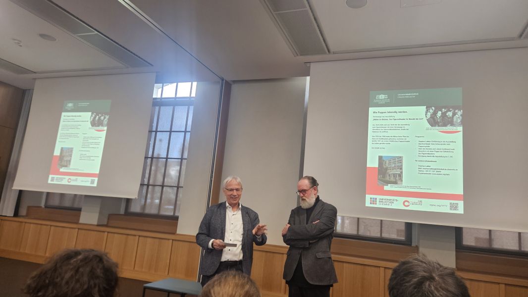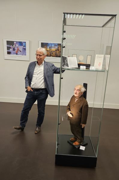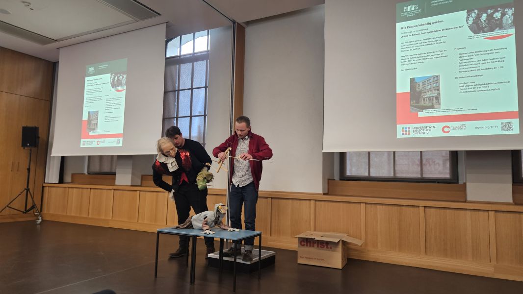 Um 16:00 Uhr wurde die Ausstellung "Bühne im Kleinen" mit einer Vernissage eröffnet. Stephan Luther führte in die Ausstellung ein und betonte, dass die Idee zur Ausstellung bereits vor dem Einzug der Universitätsbibliothek in das neue Gebäude geboren wurde. Im Jahre 2025 waren es 50 Jahre her, dass die Puppenbühne ins Provisorium in das Gebäude am Schillerplatz einzog. Dass dieses Provisorium dann mehr als 40 Jahre währte, konnte damals wohl keiner ahnen. In diesem Jahr feiert das Figurentheater Chemnitz den 75. Jahrestag der Gründung. Im Dezember 1951 wurde das Stück "Die Entführung aus dem Serail" nach einer Oper von Mozart als Puppentheater mit Stabpuppen auf die Bühne des Opernhauses gebracht. Pedrillo und Blondchen finden sich als Originalpuppen in der ersten Vitrine der Ausstellung wieder. Beide Ereignisse wurden zum Anlass genommen, die Ausstellung jetzt zu gestalten und im 1. Obergeschoss der Universitätsbibliothek einer Öffentlichkeit zu zeigen.