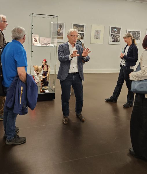 In einem geführten Rundgang durch die Ausstellung wurde der Nachmittag abgerundet. Lars Rebehn vom Puppentheatermuseum Dresden brachte hier sein profundes Wissen ein und gab so manche Anekdote und Geschichte zum Besten. Wenn Puppen lebendig werden, wird das Figurentheater und seine Einordnung in den kulturhistorischen Kontext zu einer spannenden Geschichte.