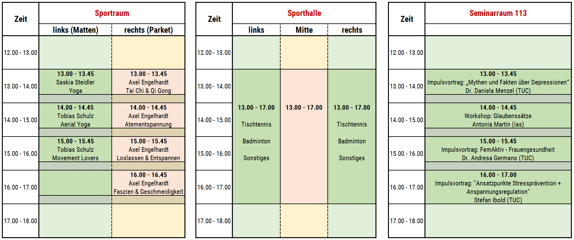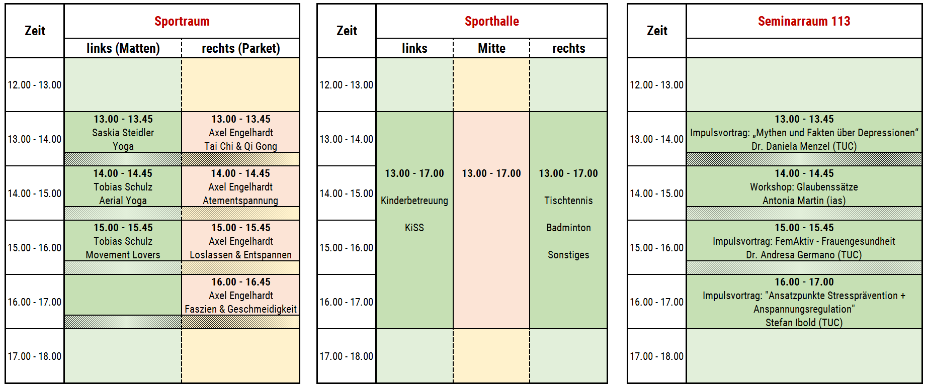 Machen Sie bei unseren Entspannungs- und Bewegungskursen sowie Impulsvorträgen mit oder gehen Sie spontan auf Entdeckungstour durch die Informationsstände unserer Hochschul- und Kooperationspartner (TK, AOK, Barmer, ias, UK Sachsen, Familienservice, Arbeitssicherheit, Psychosoziale Beratungsstelle und Koordinatorin für Inklusion) im Foyer der Sporthalle. Und wenn Sie Lust verspüren, eine kleine Runde Tischtennis oder Badminton zu spielen, bringen Sie einfach Ihre Sportsachen (inkl. Hallenschuhe) mit – für den Rest sorgen wir.
