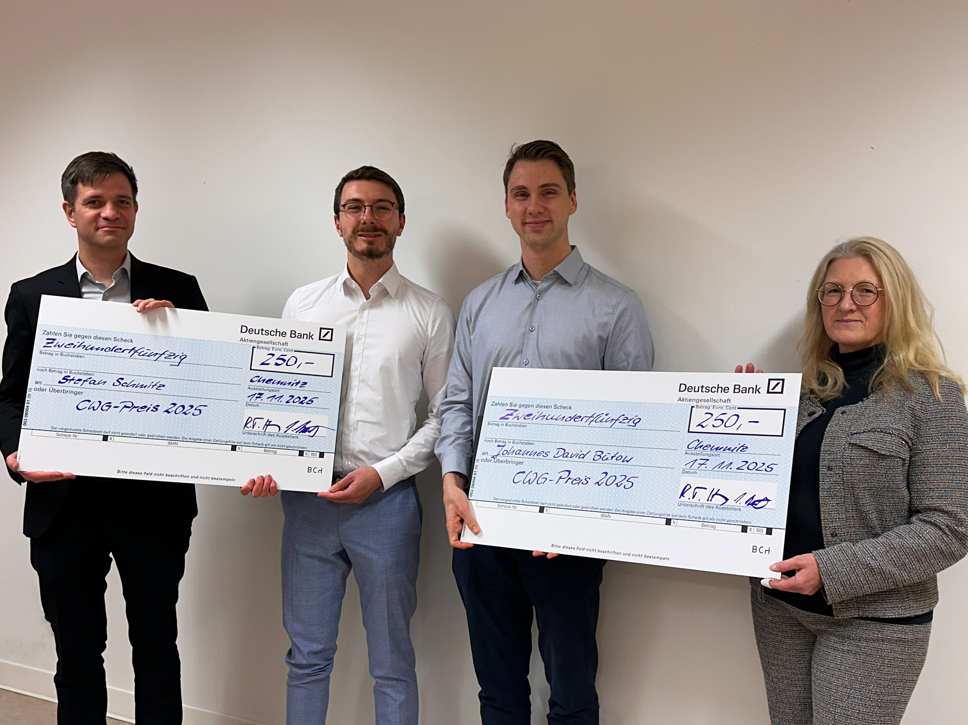 Die Chemnitzer Wirtschaftswissenschaftliche Gesellschaft e. V. hat den „CWG-Preis 2025“ für herausragende Abschlussarbeiten an der Fakultät für Wirtschaftswissenschaften verliehen. Den jeweils mit 250 Euro dotierten Preis erhielten Johannes D. Bütow (MSc Rechnungslegung & Unternehmenssteuerung, Bild: Mitte rechts), Jannis Kerl (MSc Wirtschaftsingenieurwesen, Übergabe im Dezember) sowie Stefan Schmitz (MSc Management & Organization Studies, Bild: Mitte links). Die Übergabe erfolgte im Rahmen der Sitzung des Fakultätsrates durch den Vorsitzenden der CWG, Prof. Dr. Torsten Heinrich, sowie durch die Dekanin der Fakultät, Prof. Dr. Silke Hüsing.