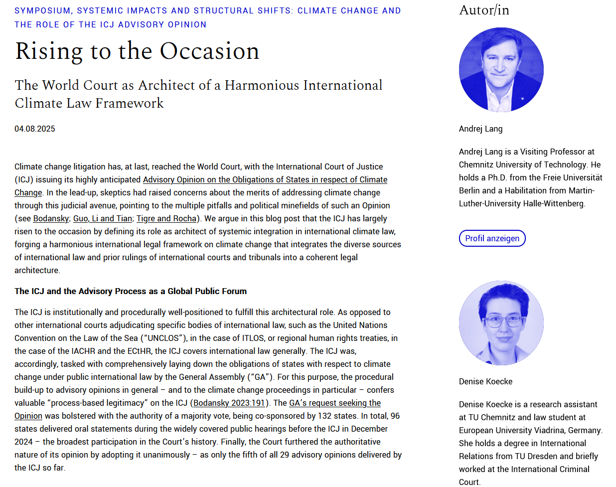 Im Nachgang zum Klimaschutz-Gutachten des Internationalen Gerichtshofs (IGH) haben PD Dr. Andrej Lang und Denise Köcke einen Beitrag im Rahmen des Symposiums “Systemic Impacts and Structural Shifts: Climate Change and the Role of the ICJ Advisory Opinion” auf dem Völkerrechtsblog veröffentlicht. Der Blog-Post “Rising to the Occasion – The World Court as Architect of a Harmonious International Climate Law Framework” beleuchtet, wie das Gutachten des IGH die unterschiedlichen Rechtsquellen im Bereich des internationalen Klimaschutzrechts miteinander verbindet und reflektiert die institutionelle Rolle des Weltgerichts in diesem Kontext.